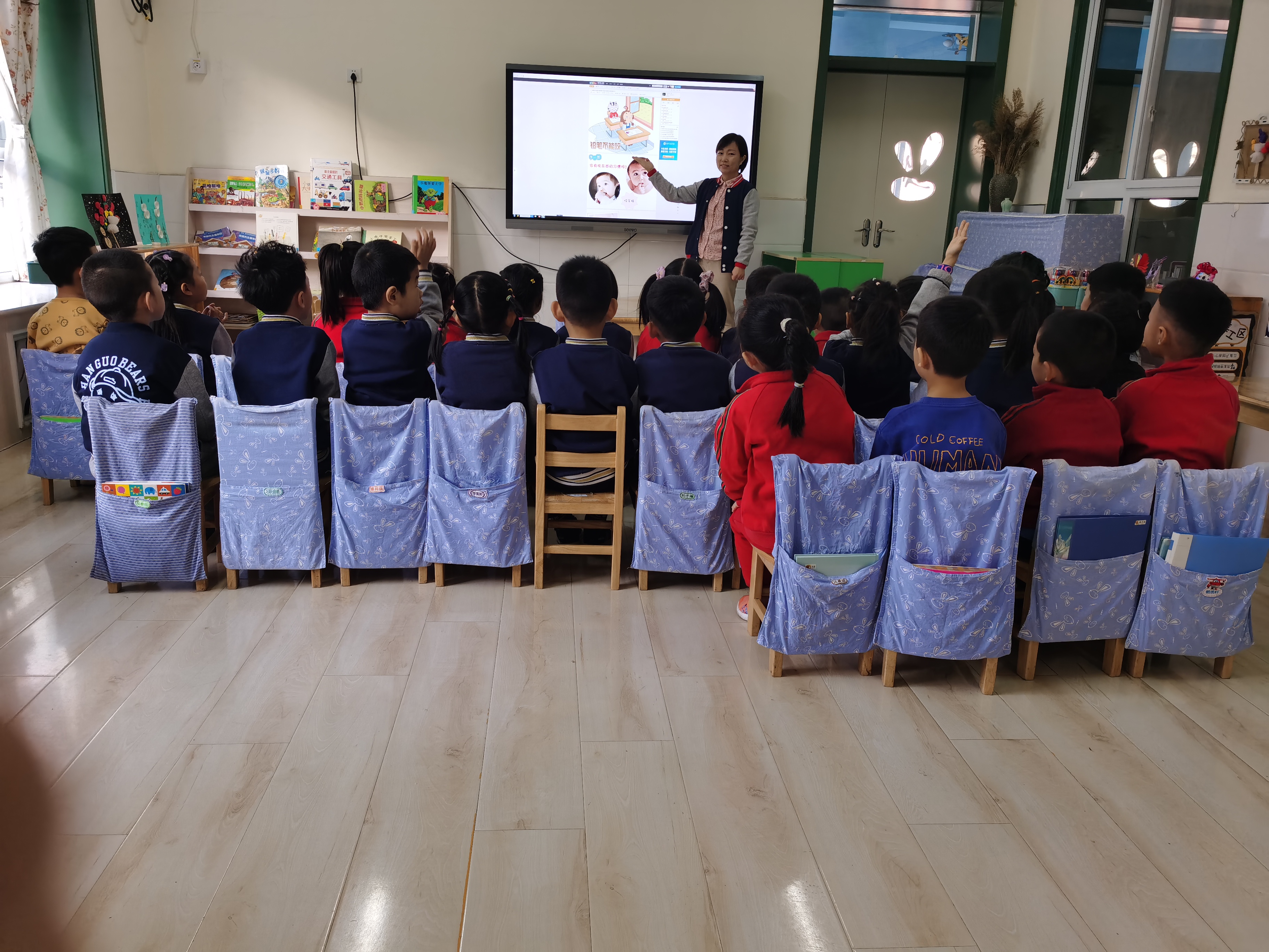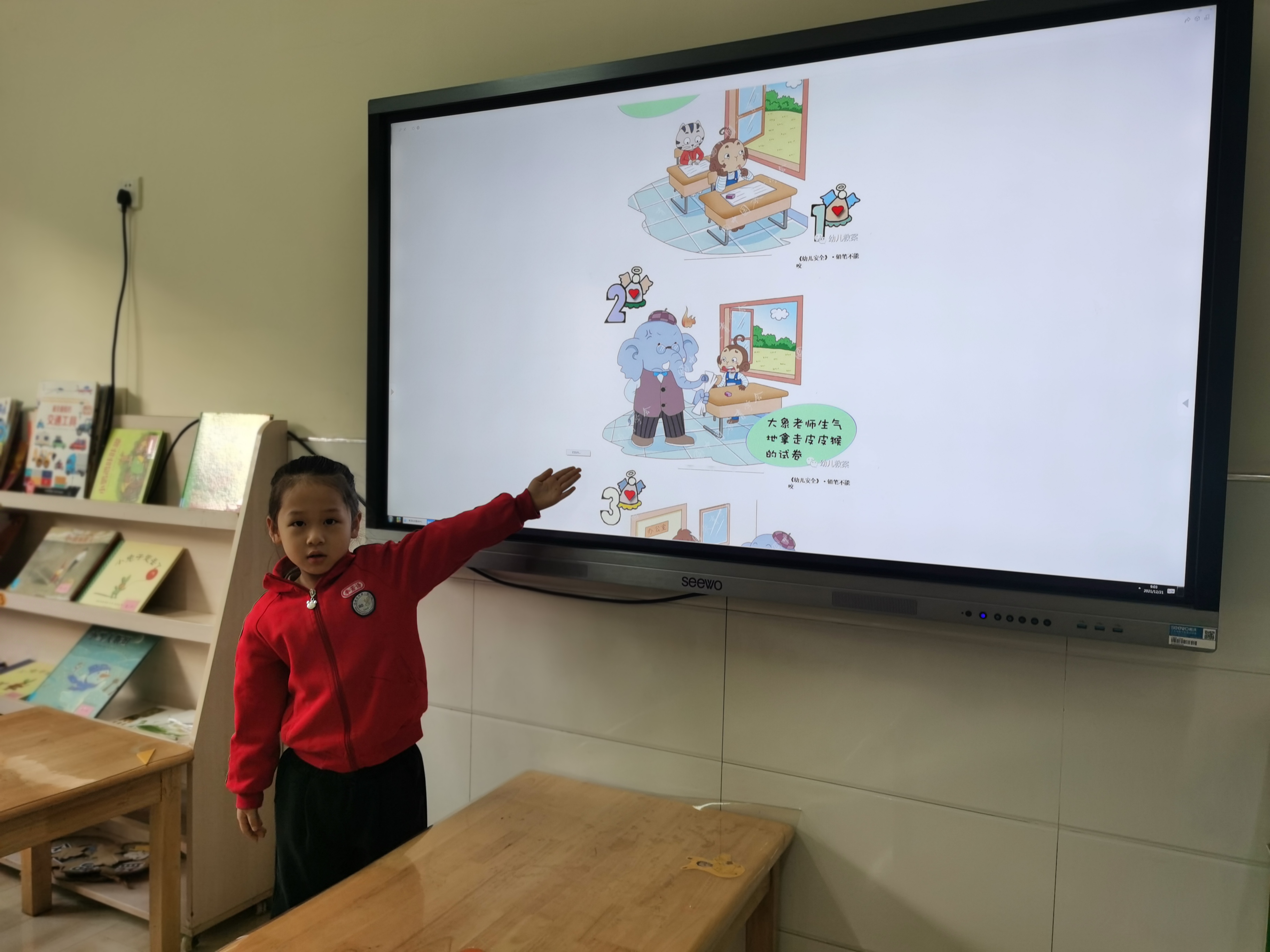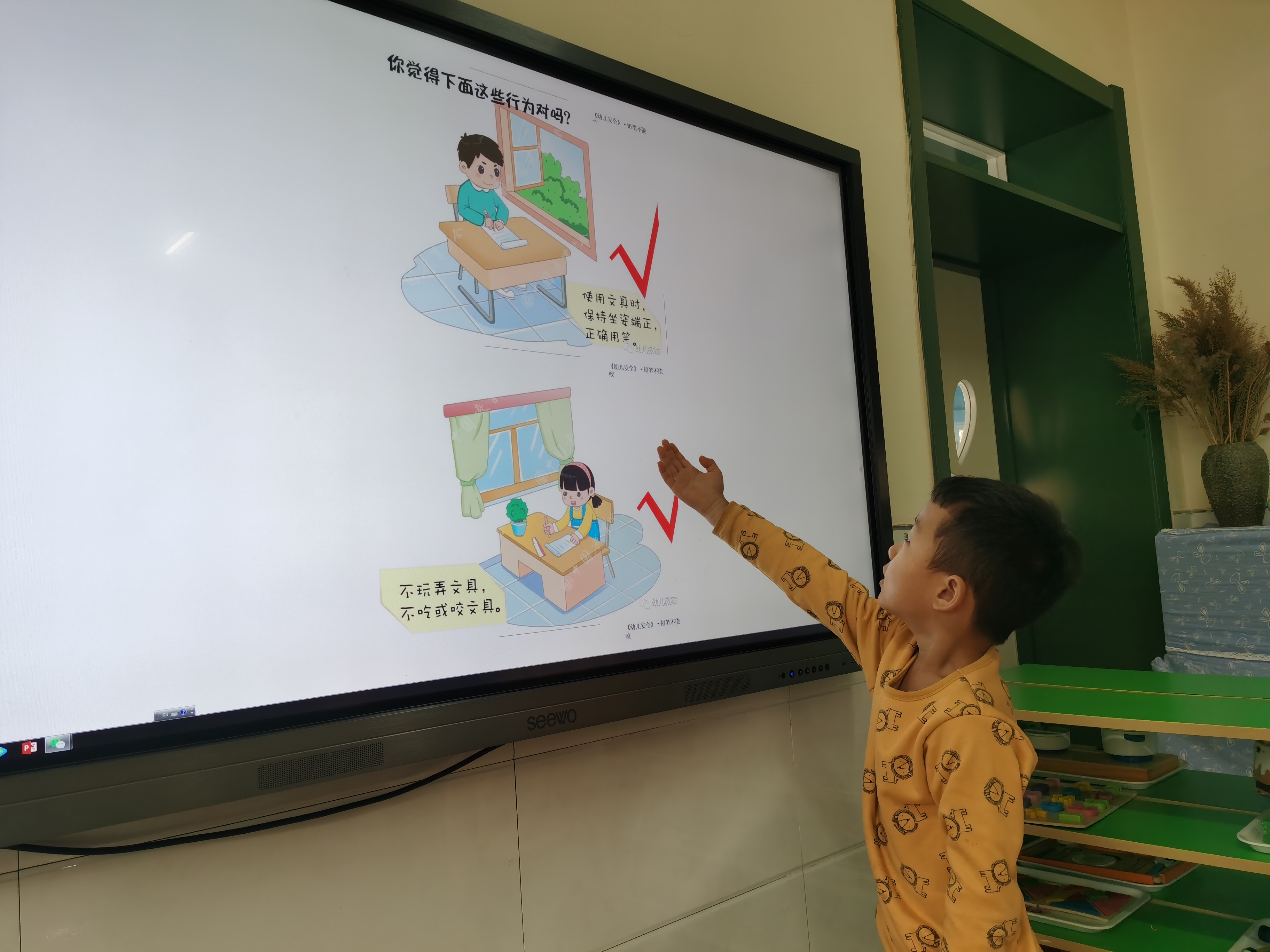 活动的最后,我们通过出示图片判断正误的形式,让小朋友们进行实践,识别正确和错误的做法,并且学习正确的三角笔杆,三点正姿的握笔姿势。安全无小事,把安全放在首位,在幼儿一日生活、教育教学活动、游戏的各个环节中自然地进行,通过形式多样的活动帮助幼儿懂得自我保护的简单知识和方法,真正保证幼儿安全。