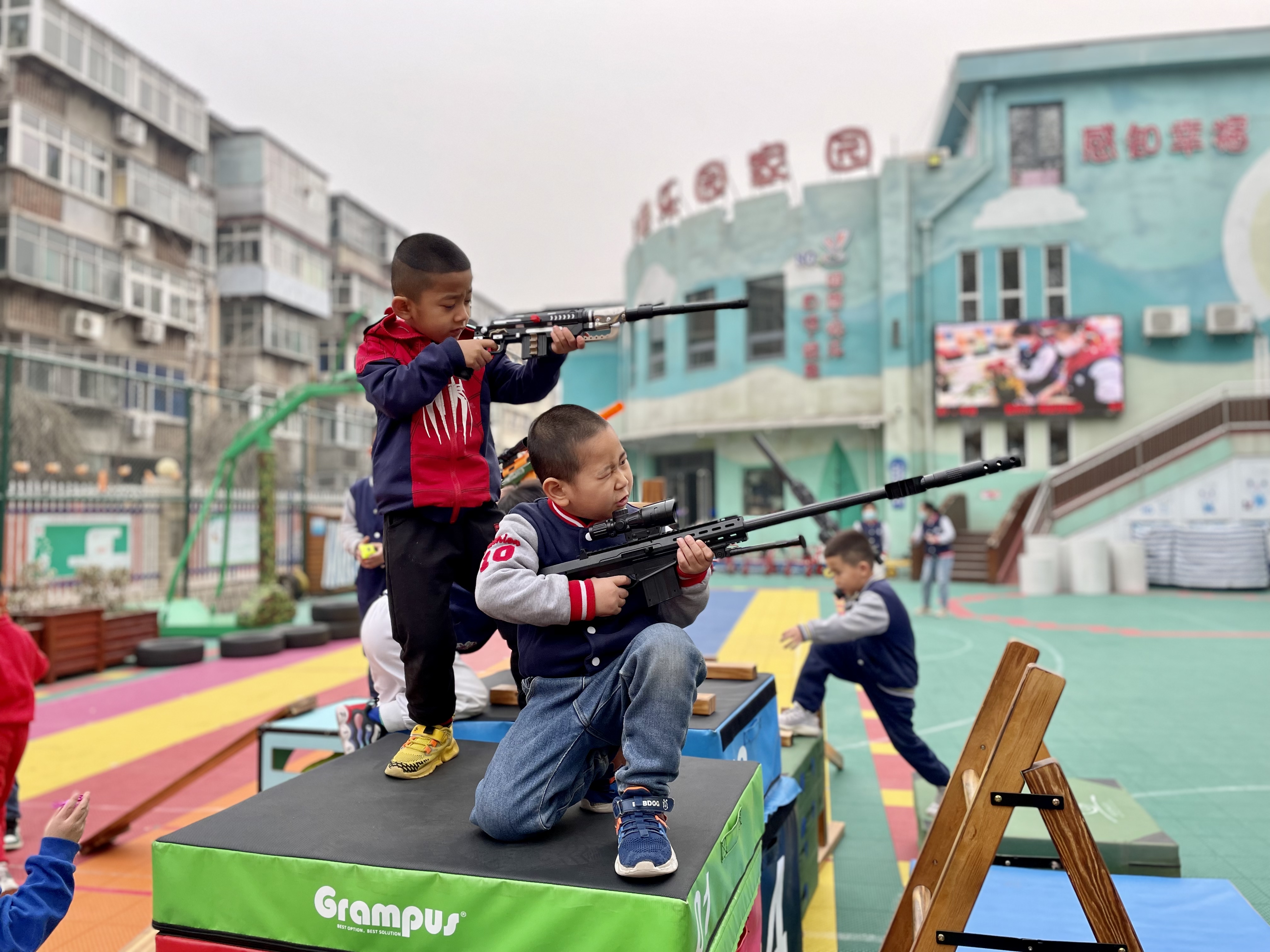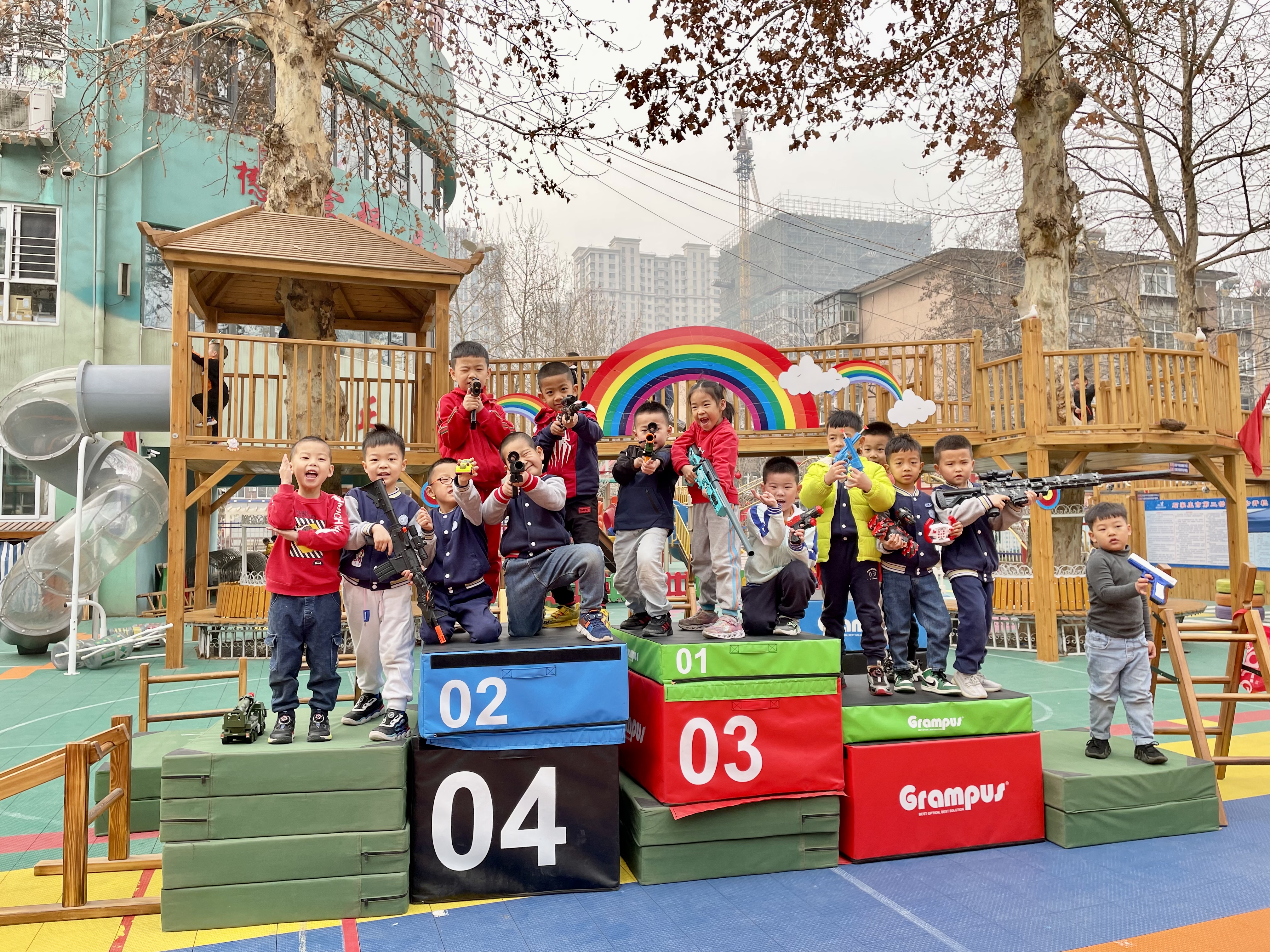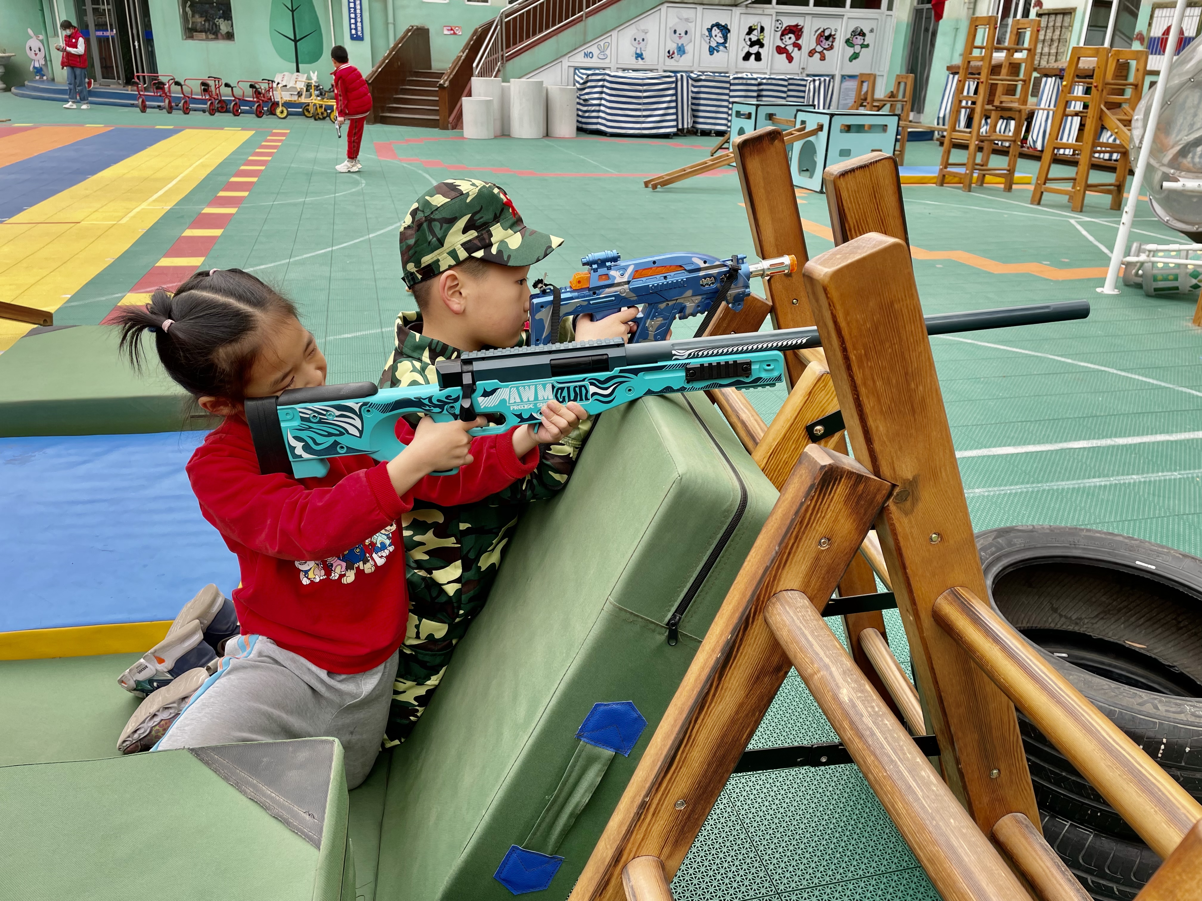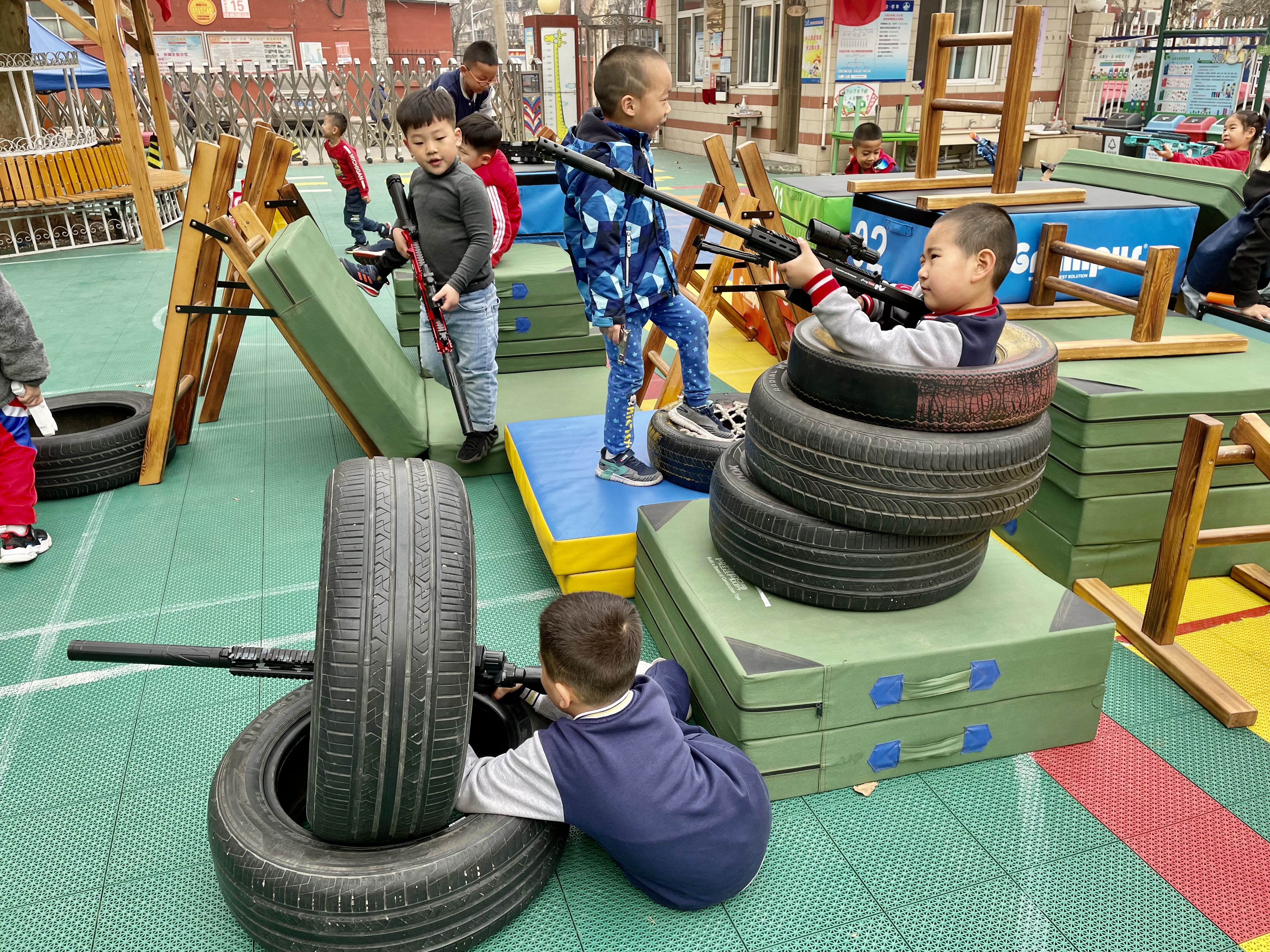又到了孩子们最喜欢的星期五啦!为了给孩子们一个真正快乐有意义的童年,幼儿园坚持适宜性、参与性、开放性原则,创设生活化、情境化、课程化、游戏化的环境,将游戏与课程有效整合,给孩子们提供了“多彩星期五”的活动,在这一天,孩子们可以充分自由的去探索、去想象、去创造,孩子们在游戏中学习、在游戏中养成良好的习惯,在游戏中健康快乐成长。 在最受孩子们喜欢的“军事基地”活动中,孩子们利用一些辅助器械,进行防御工事的搭建,在此过程中孩子们通过一次次尝试,一次次体验,不断克服困难,最终搭建了理想中的防御工事并开展游戏。 孩子们的游戏需要自由自主的空间,孩子们的能力也需要在创造愉悦氛围中获得发展,让我们一起来看看孩子们一上午的精彩表现吧!