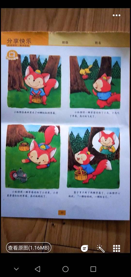 本周作业:让幼儿试着说一说故事《分享快乐》的内容,并完成16页的操作