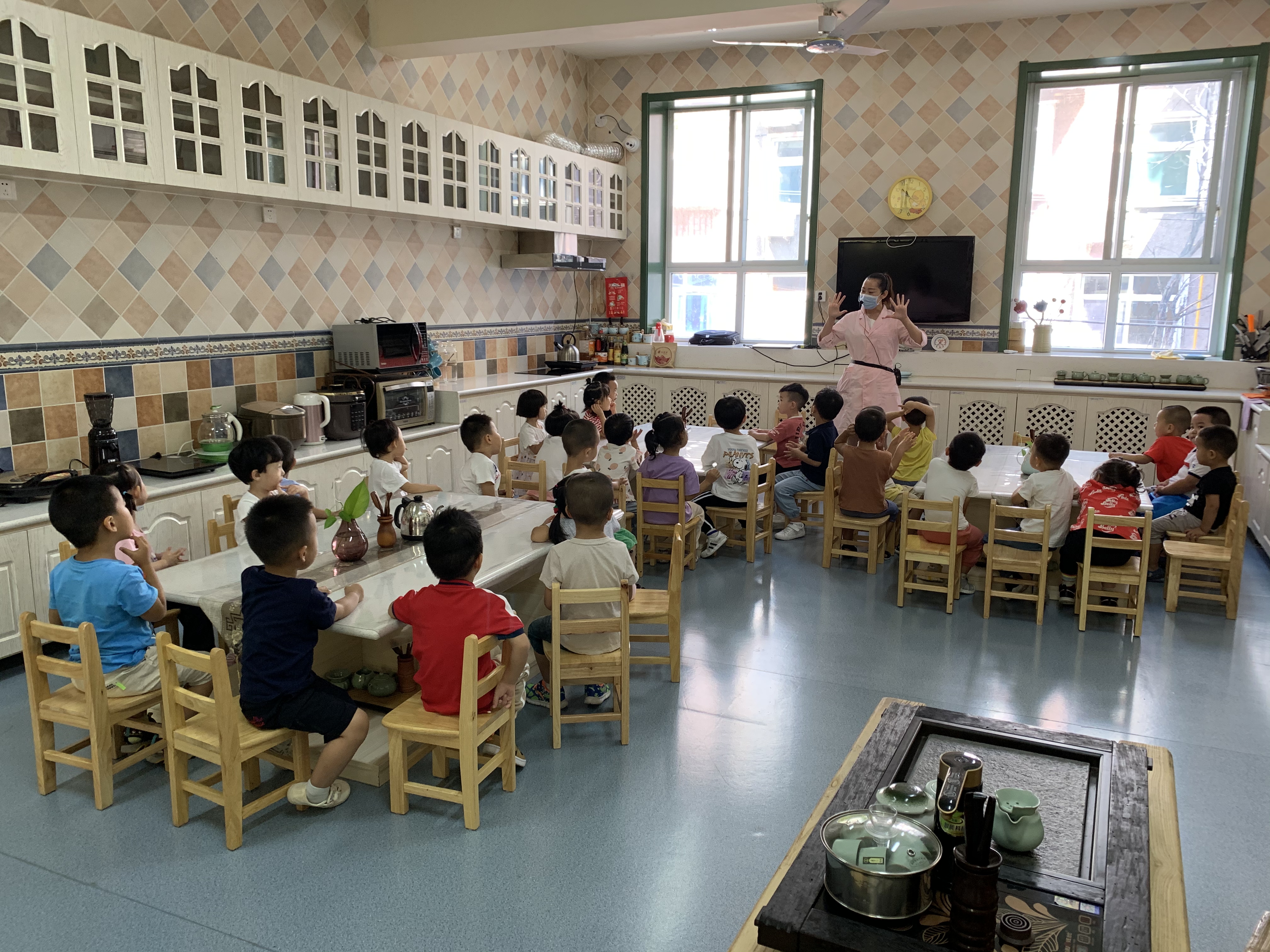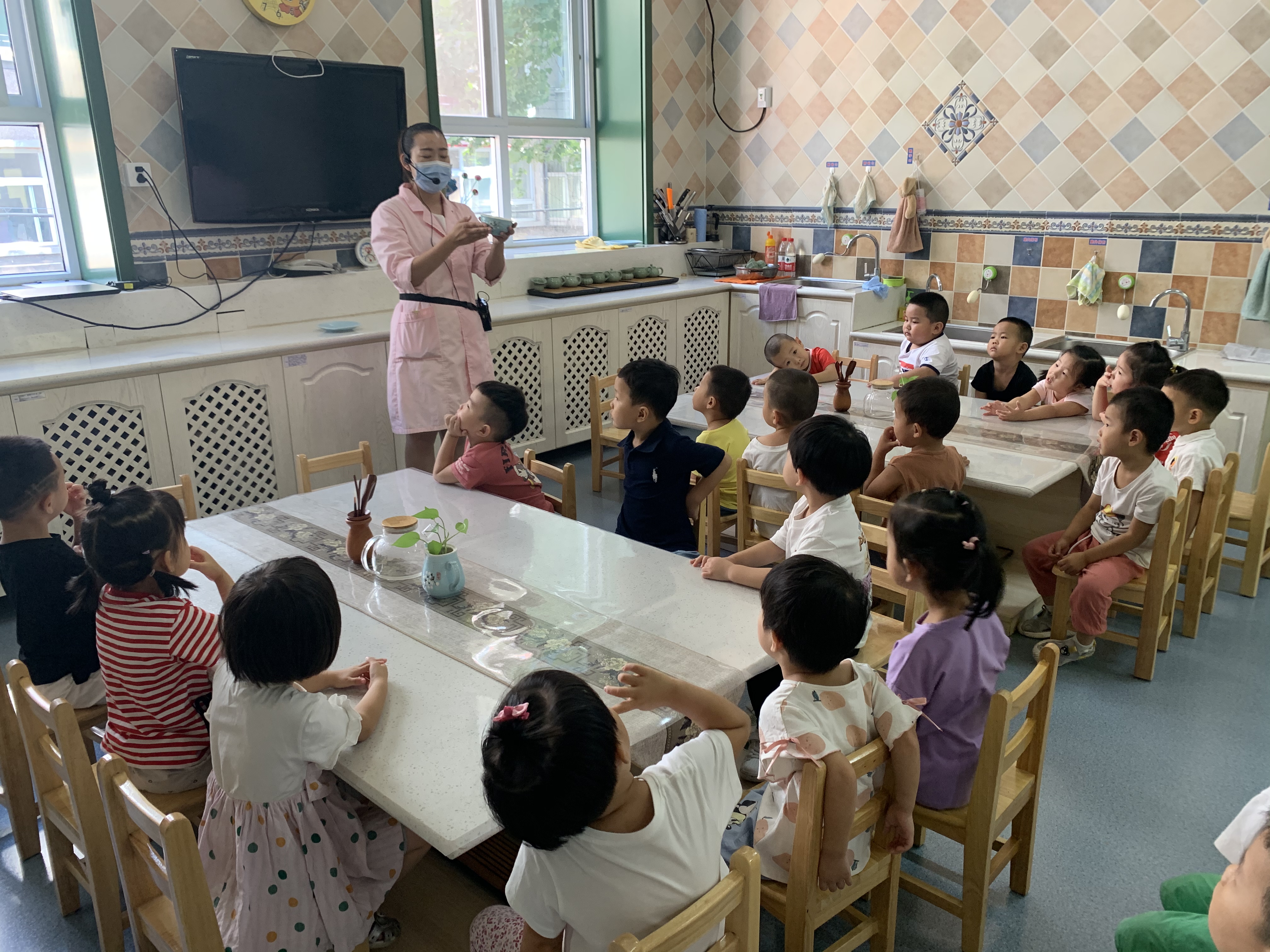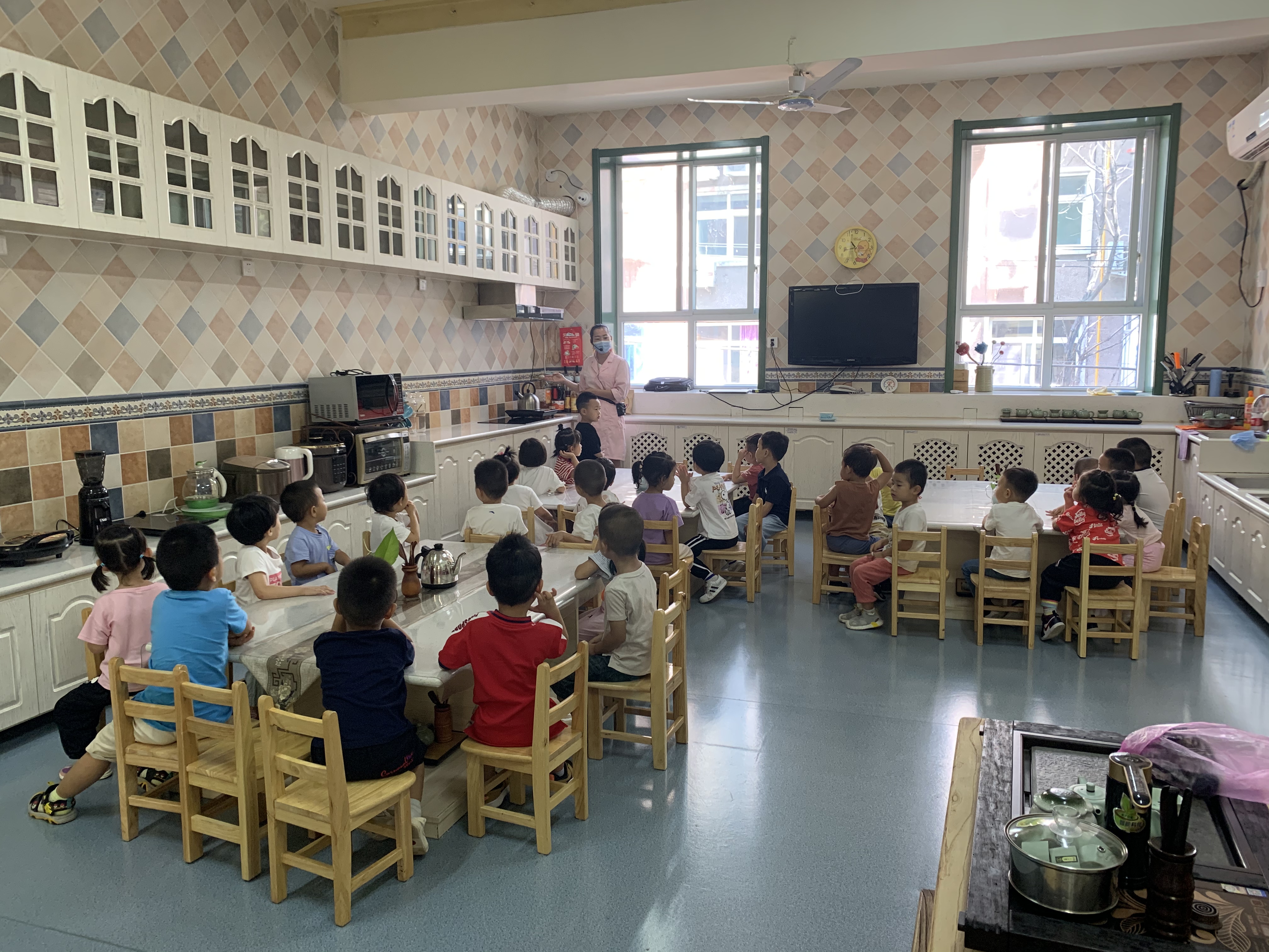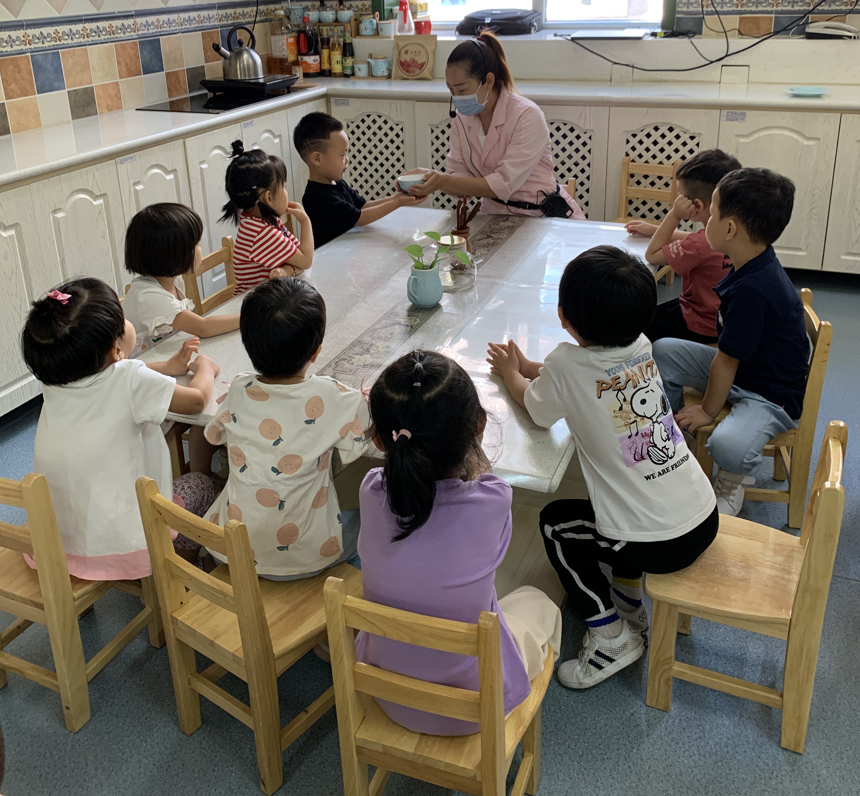 食育是我园的一项特色课程,也是幼儿非常喜欢的活动。幼儿阶段是儿童身体发育最为迅速的时期,也是形成安全感和正确选择食物的重要阶段。在食育活动中,引导幼儿亲身参与食材的采摘,食物的准备和制作过程,和餐后的整理等,能够促进幼儿健康体魄和饮食习惯等与健康领域相关方方面面的发展。 本周四上午苗三班的小朋友们第一次走进食育工坊,郭老师为孩子们介绍了这里的电器电饼铛、电磁炉等,之后孩子们尝试一个一个地传递碗和盘子,为今后食育活动的开展做好准备。 食物和教育,一个滋养身体,一个浸润灵魂,寓教育于食物,培养面向未来的孩子。走进食育工坊,美食之旅从这里开启……