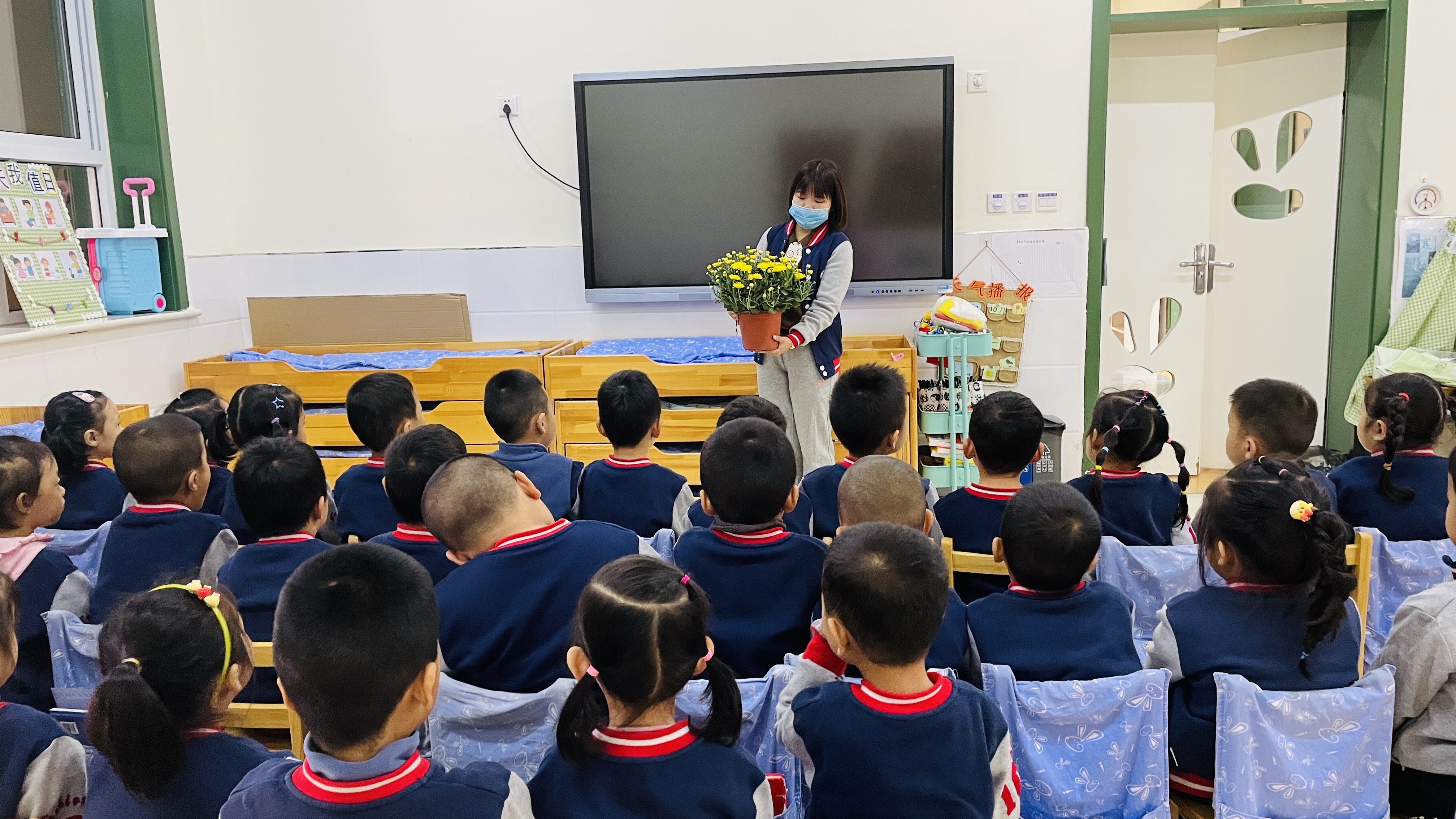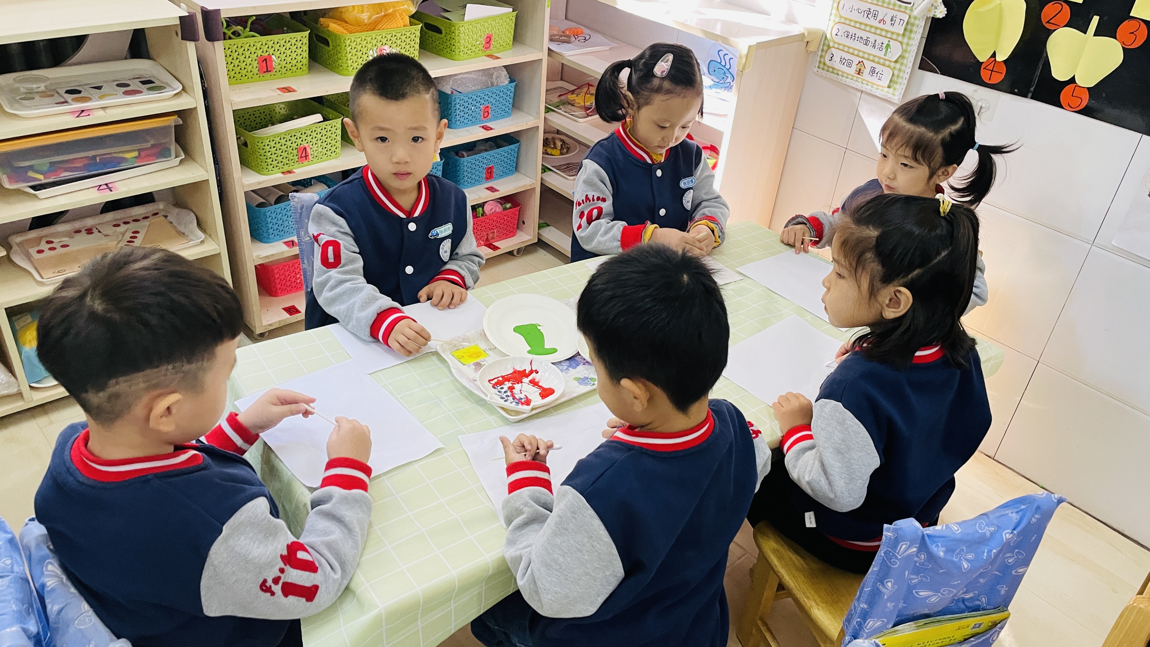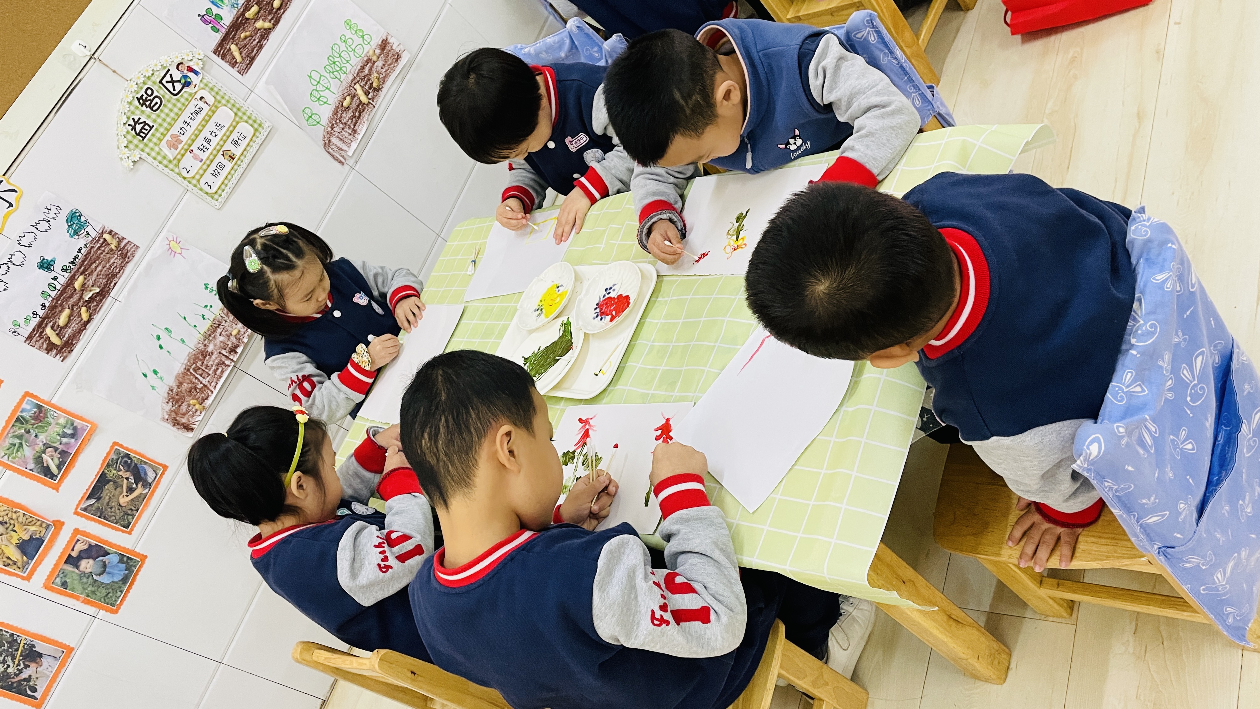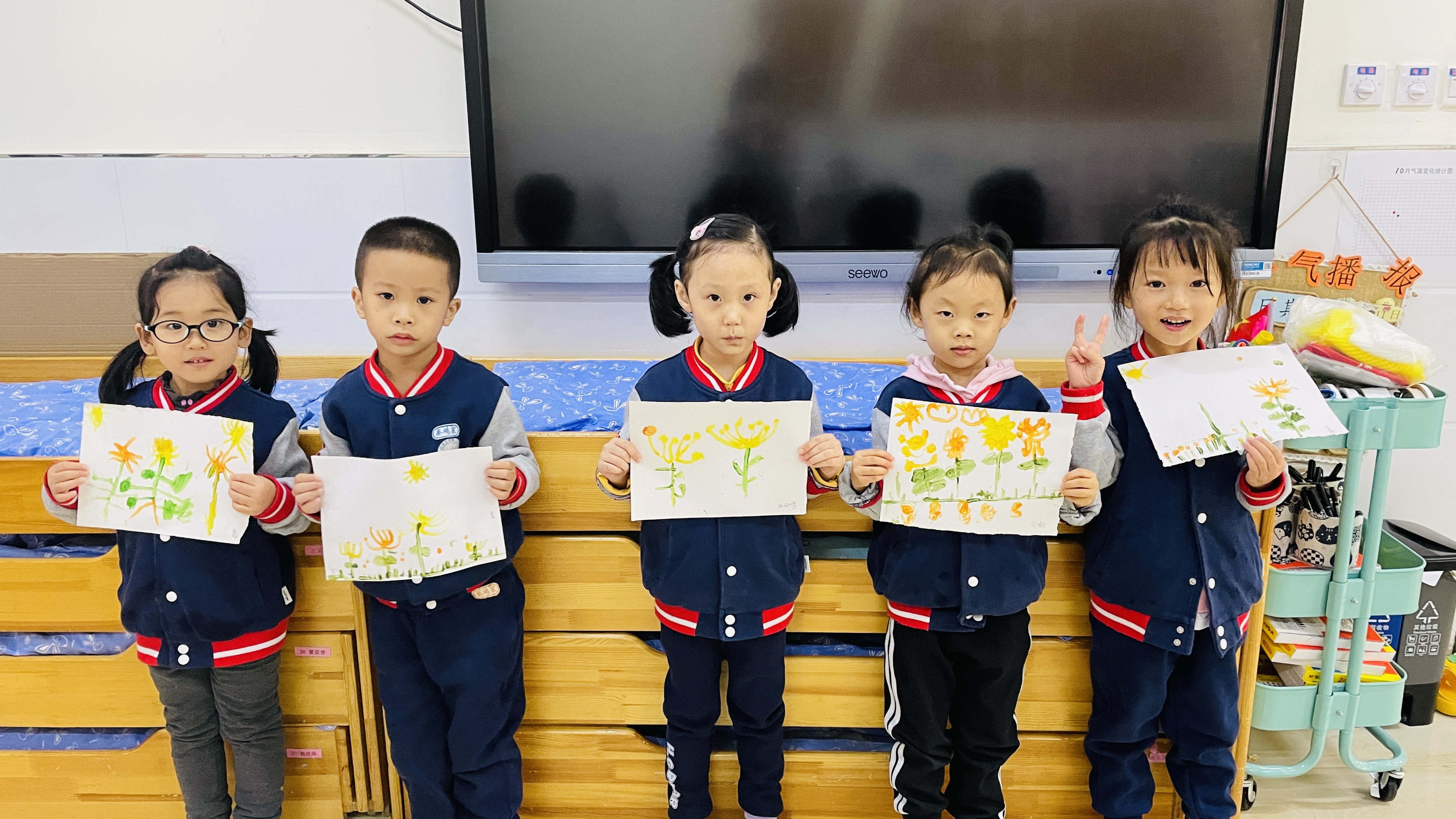 秋天是丰收的季节,也是多彩的季节,各种色彩斑斓的菊花竞相开放,菊花不畏寒冷,是秋季最具有代表性的花种,寒露节气的活动便围绕菊花来展开。为了加深幼儿对菊花的认识,今天上午我们开展了美术活动—“菊花朵朵开”,让幼儿在创造性的活动中,进一步了解菊花的外形特征,感受秋天菊花盛开的美。 本次活动是以水粉画的形式来呈现,水粉画作为一个独具魅力的色彩画种,其良好的色彩性能和丰富的表现力是孩子们探索色彩世界的表现方式之一。动手操作前,老师带领幼儿认识了不同的菊花,菊花多姿多彩,红的像火,黄的像金,白的像雪,粉的像霞……让幼儿在欣赏不同颜色菊花的基础上,仔细观察菊花的花瓣、叶子、形状等,培养孩子的观察能力,激发幼儿的探索兴趣。不同菊花的花瓣长得都不一样,有的长,有的短,有的朝里弯,有的朝外弯,有的像妈妈的头发,有的像绽放的烟花,孩子们用棉签和颜料“种”出一朵朵美丽的菊花。 这种作画方式操作方便、气氛轻松,画面变化无穷,符合幼儿好奇、好动的心理特点。幼儿在活动中表现得非常开心,能大胆想象、大胆操作,达到了良好的效果,同时也激发了幼儿对色彩的理解和运用,提高幼儿的审美能力。