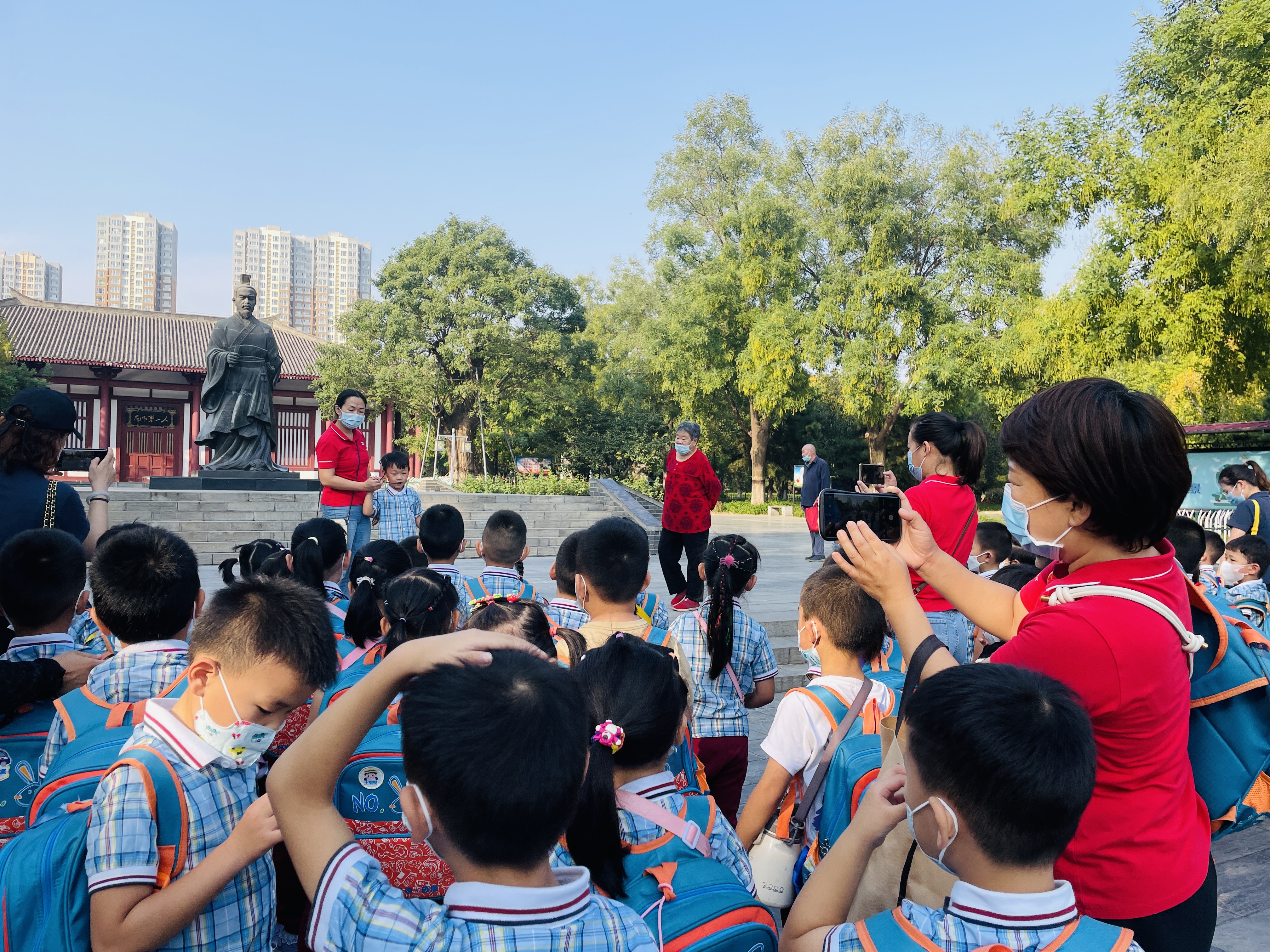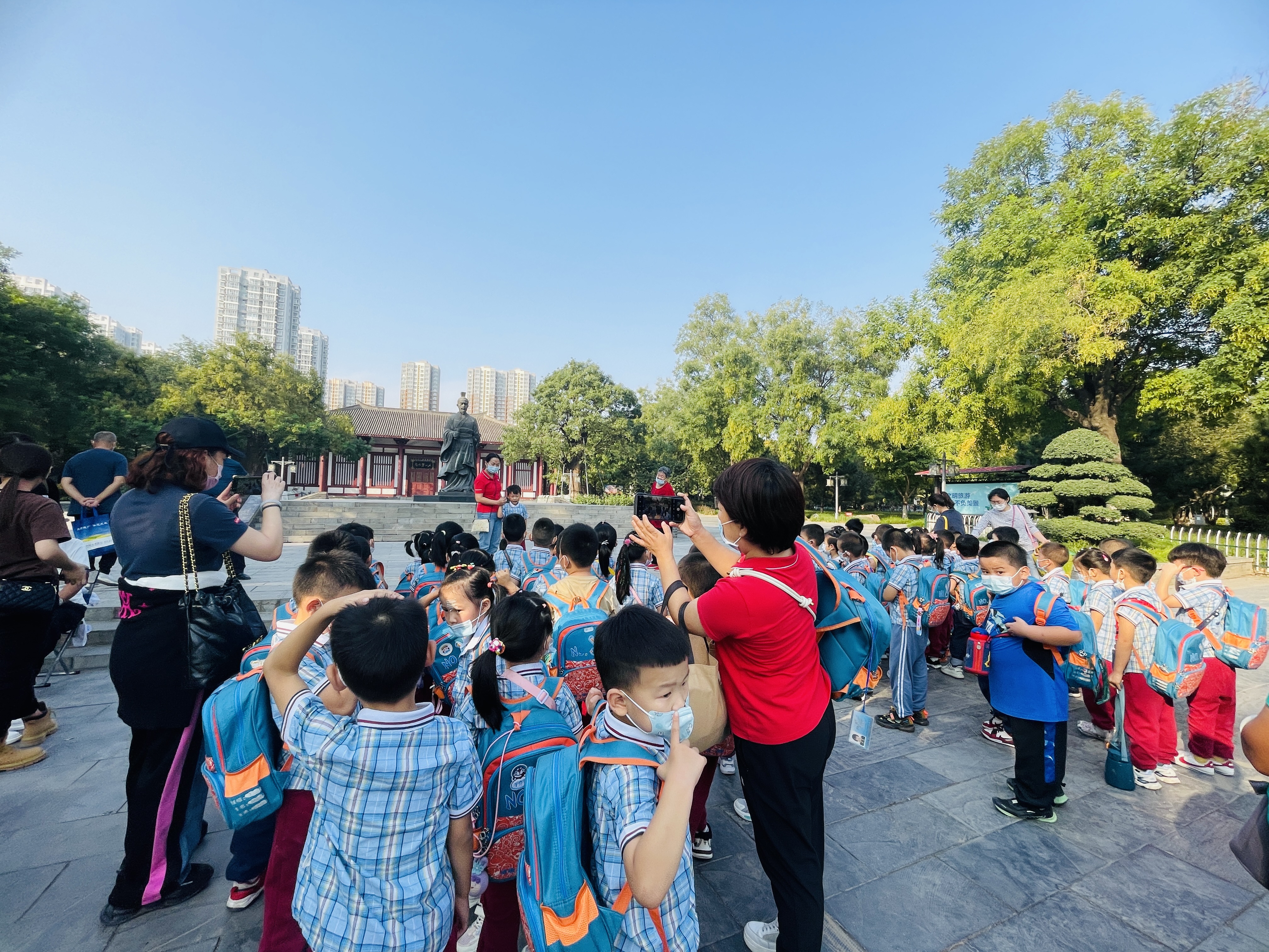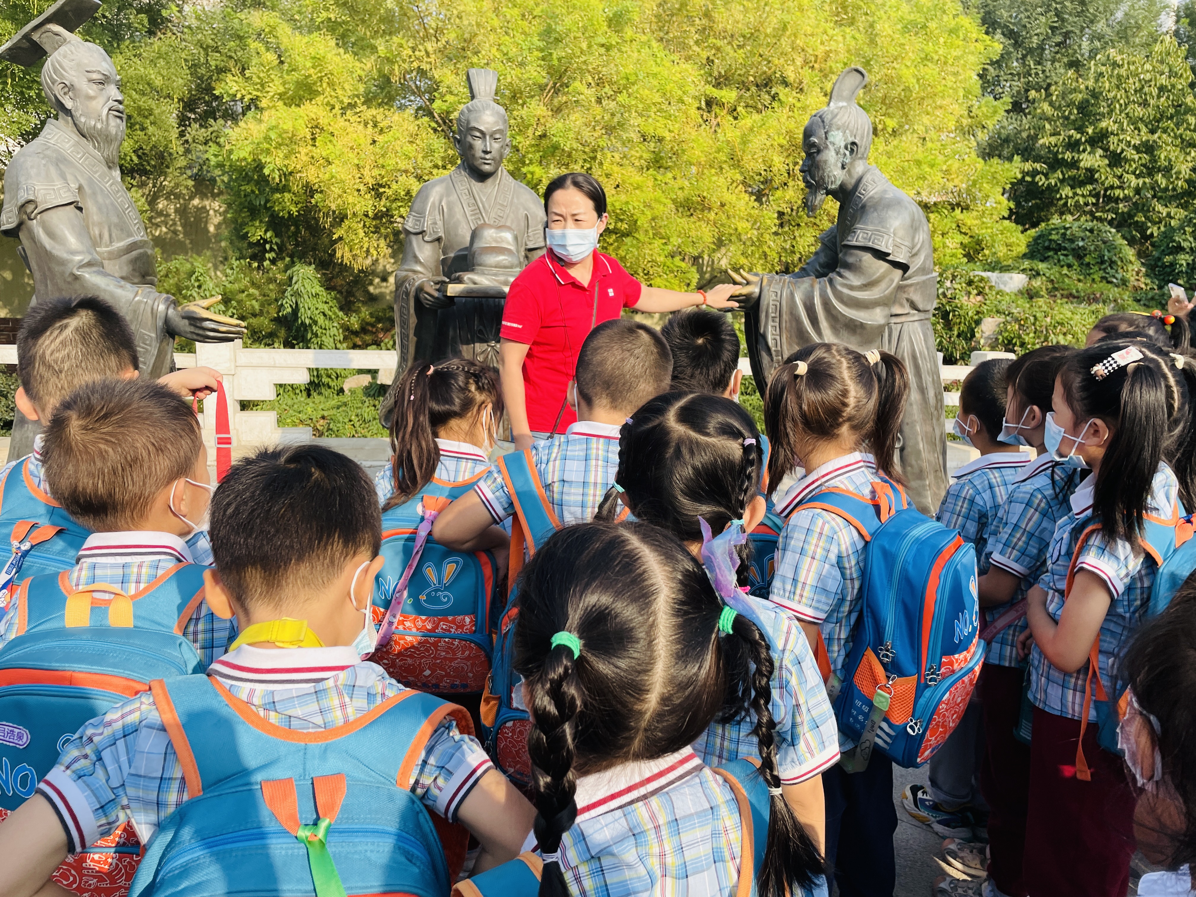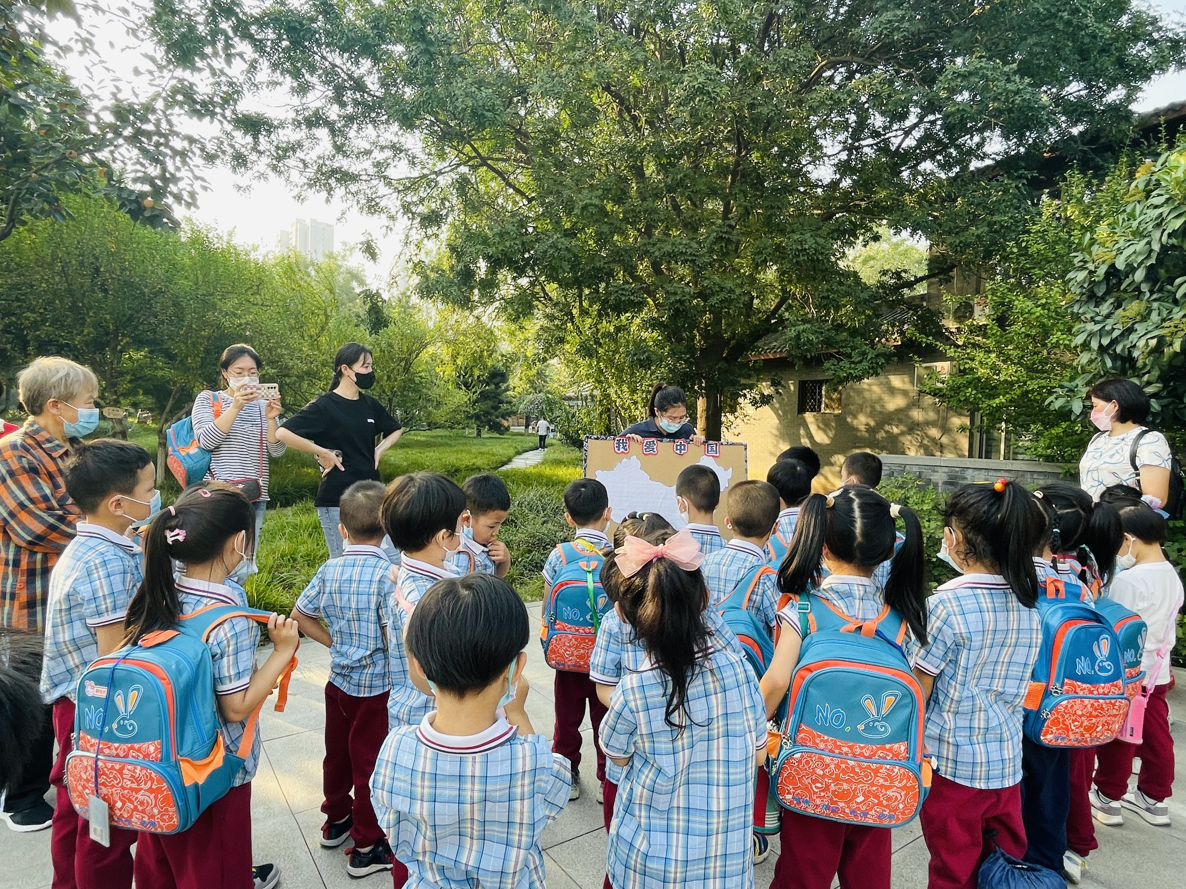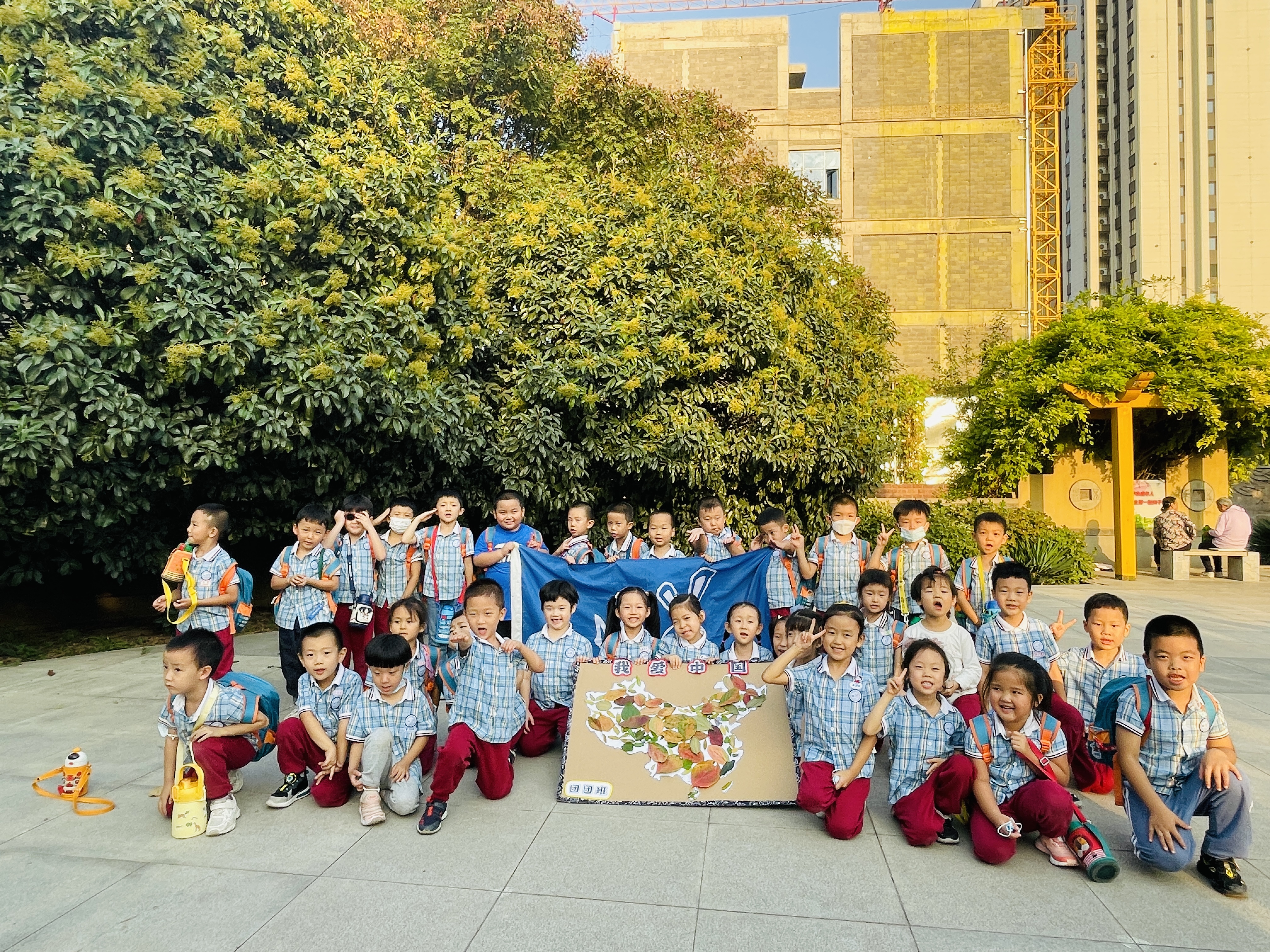 9月是我园的红色教育月,为了激发幼儿爱祖国、爱家乡的情感,为了让孩子们了解家乡的历史英雄人物,团团班小朋友和老师、家长志愿者一起步行去往赵佗公园,一路上伴随着秋日的阳光牵手而行。 来到赵佗公园,红色的主基调贯穿始终,老师带领着孩子们驻足在赵佗石塑介绍旁,为孩子们讲述英雄人物背后的历史故事,并在纪念墙前合影留念。秋风送爽,秋日怡人,孩子们在草地上奔跑、嬉闹,捡拾秋天的落叶,发现秋天的秘密,明媚的阳光洒在孩子们身上尽显无限的美好。孩子们将捡拾的各种颜色的落叶慢慢拼凑,最后,一幅绚丽多彩的中国地图诞生了,在这个金秋季节,孩子们用自己的方式感受秋日迎接祖国华诞,为祖国妈妈献上最美好的祝福!