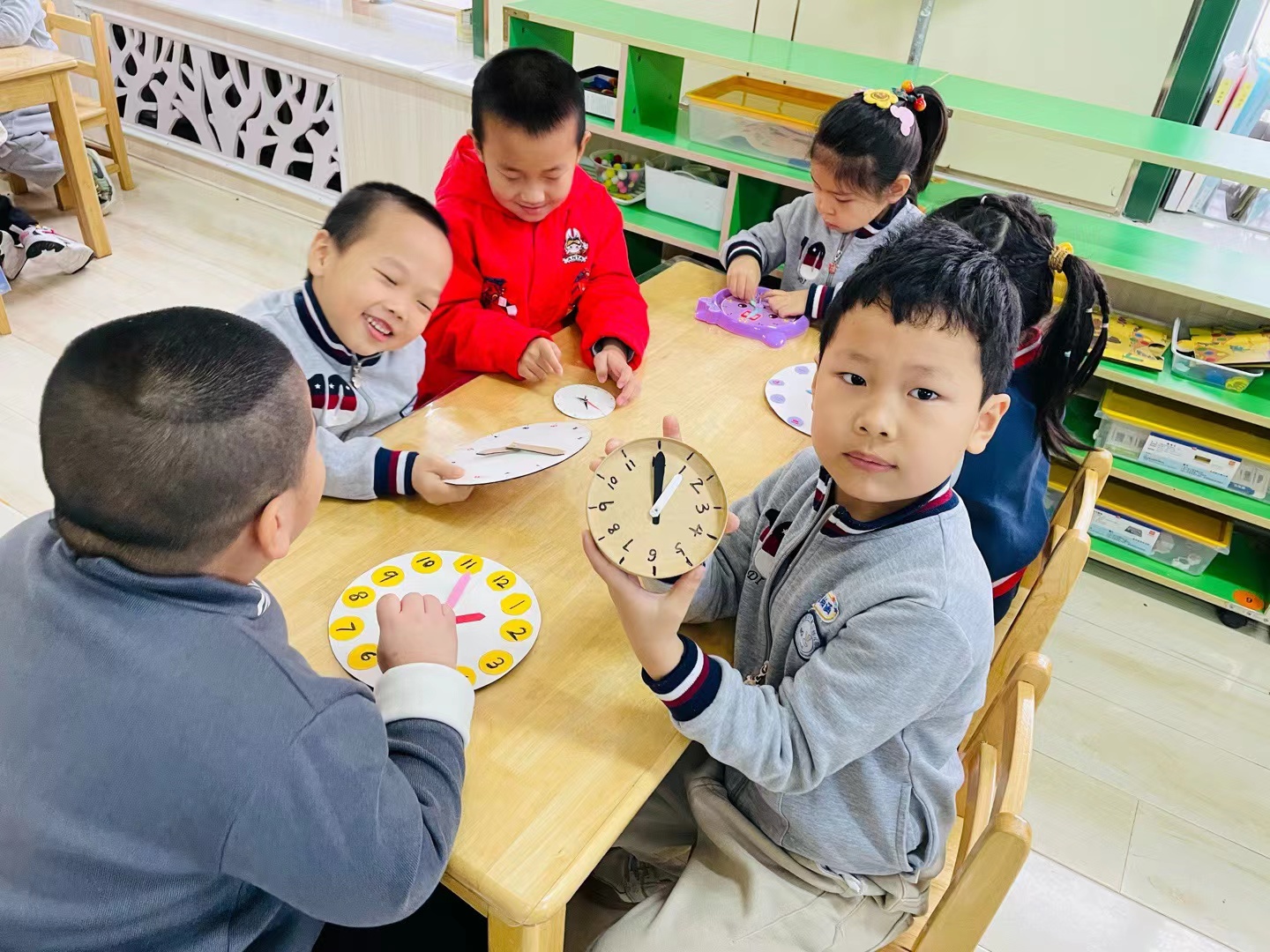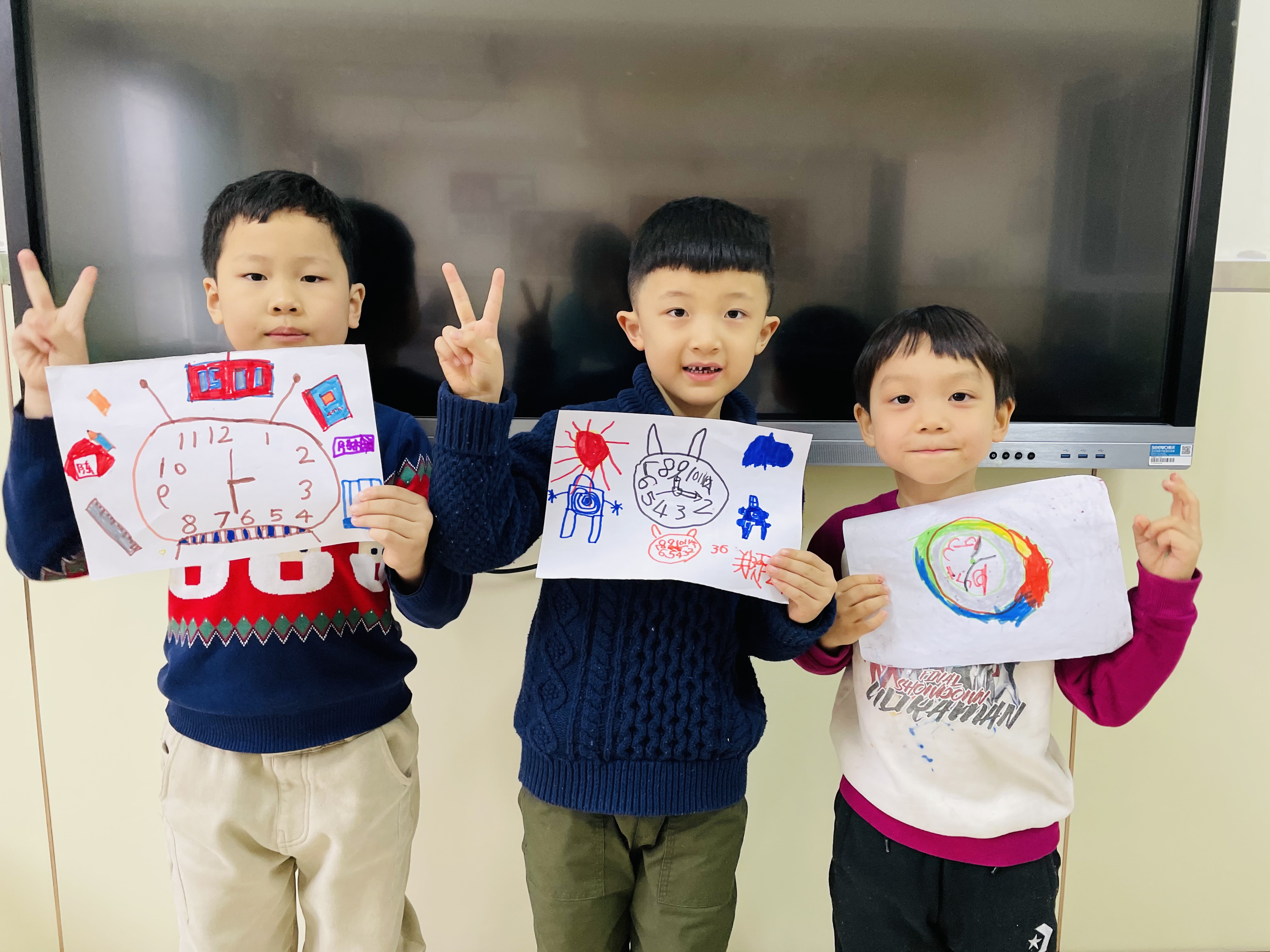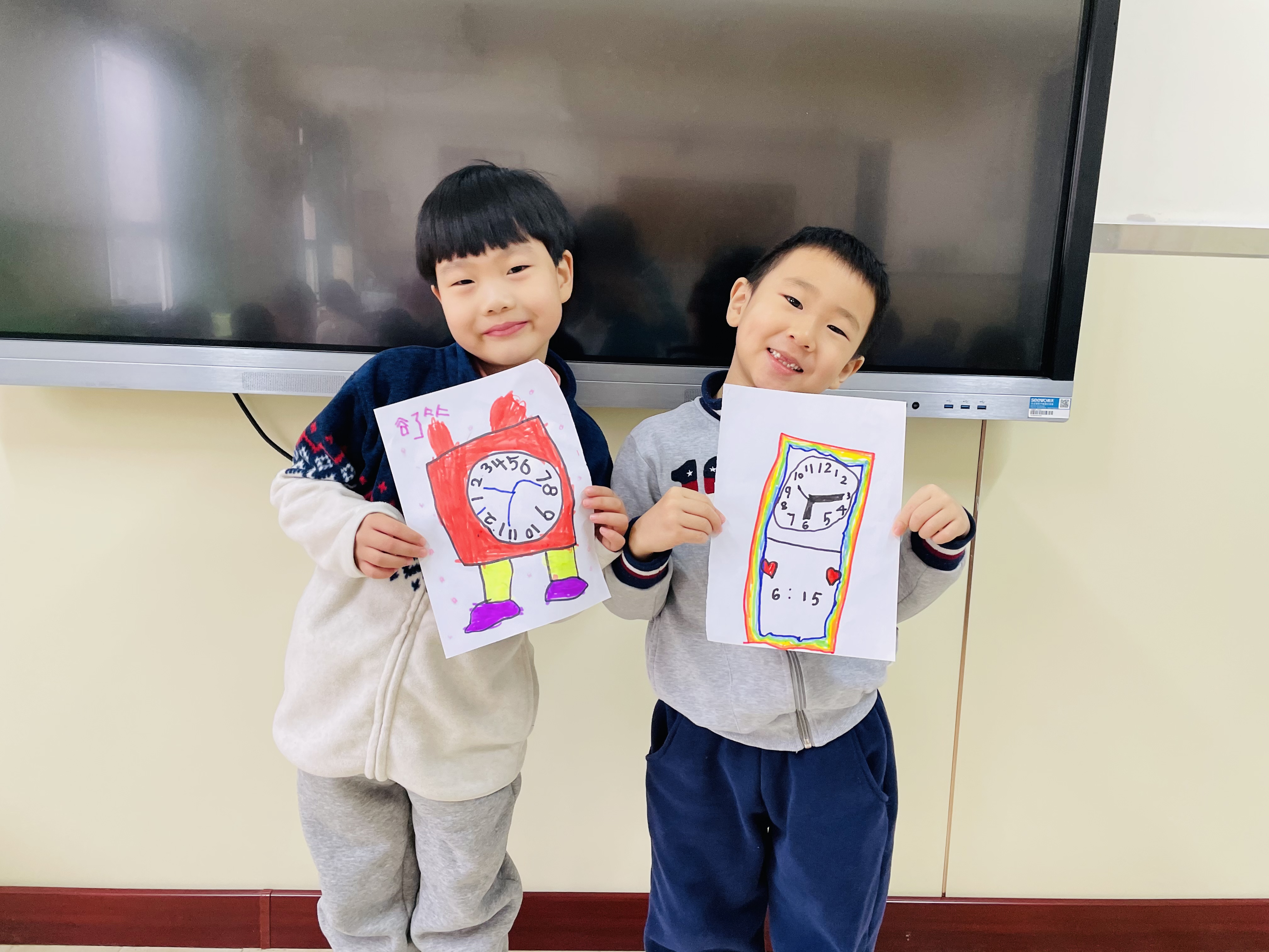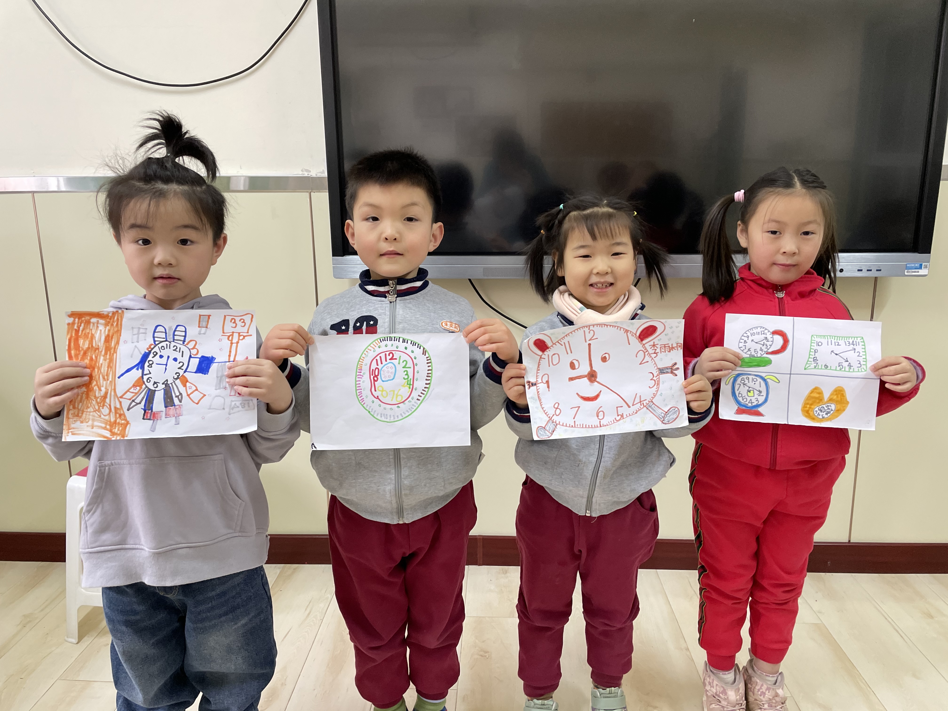 钟表对于大班孩子们来说并不陌生,它每时每刻都伴随在孩子们的左右,但似乎关注钟表、指认时间都是大人们的事,对孩子们来说,时间是个抽象的概念。当关于时间的物品突然出现时,幼儿的好奇心瞬间被点燃起来,于是一场孩子们关于对于时间的探秘悄然展开了。 通过谈话讨论,让孩子们认识时钟,初步对时钟的探索感兴趣,了解一分钟的含义,通过游戏体验一分钟的长短,懂得珍惜时间,为入小学做准备;通过时钟创意画,了解钟面的基本结构,知道时钟是由12个数字,以及时针、分针和秒针组成,促进幼儿的创新思维,进一步加深对时钟的认识;通过数学活动引导幼儿学习整点和半点,让幼儿通过实际操作学会认识整点和半点,能够正确认读整点和半点,并更好地学会和掌握良好的作息时间。 幼儿的时间观念培养是幼儿成长过程中的一个重要内容,为了养成珍惜时间的好习惯,做时间的小主人,孩子们与时间定下了美丽的约定:“珍惜时间,努力做好时间的小主人!”