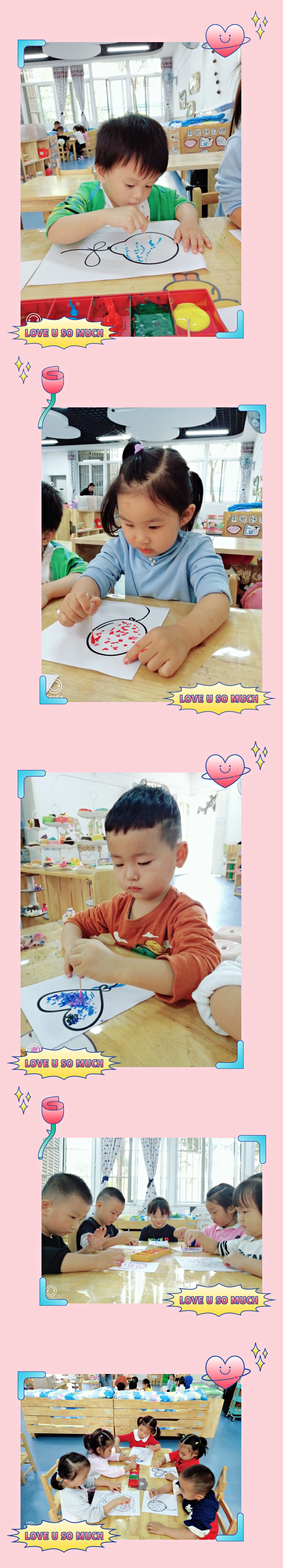 认识气球之后我们开始给气球点上漂亮的颜色,看孩子们多认真点画。