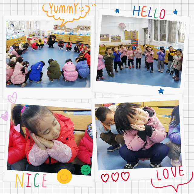 今天这个活动是“冬天到”主题活动中的一节音乐活动。“小青蛙打呼噜”这个活动中的青蛙是孩子们比较熟悉和喜爱的一个小动物形象,而歌曲中表现了青蛙冬眠的事情正好符合现在的季节特点,又丰富了孩子的科学常识。小朋友们学唱歌曲,学习小青蛙的叫声,感受旋律的气氛以及和同伴一起参加集体音乐活动的乐趣。