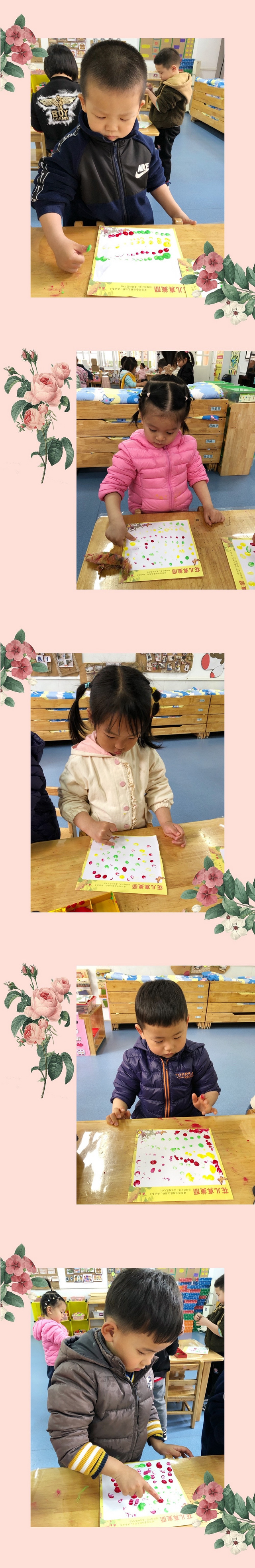手指点画是儿童早期教育的重要活动之一,它是指幼儿直接用手(包括指尖、手指、手掌、手背、手侧)蘸取适当颜料,在纸质平面媒介上进行指印、掌印、涂鸦等形式的艺术活动。今天小一班的小朋友用手指点画制作了“美丽的花儿”。