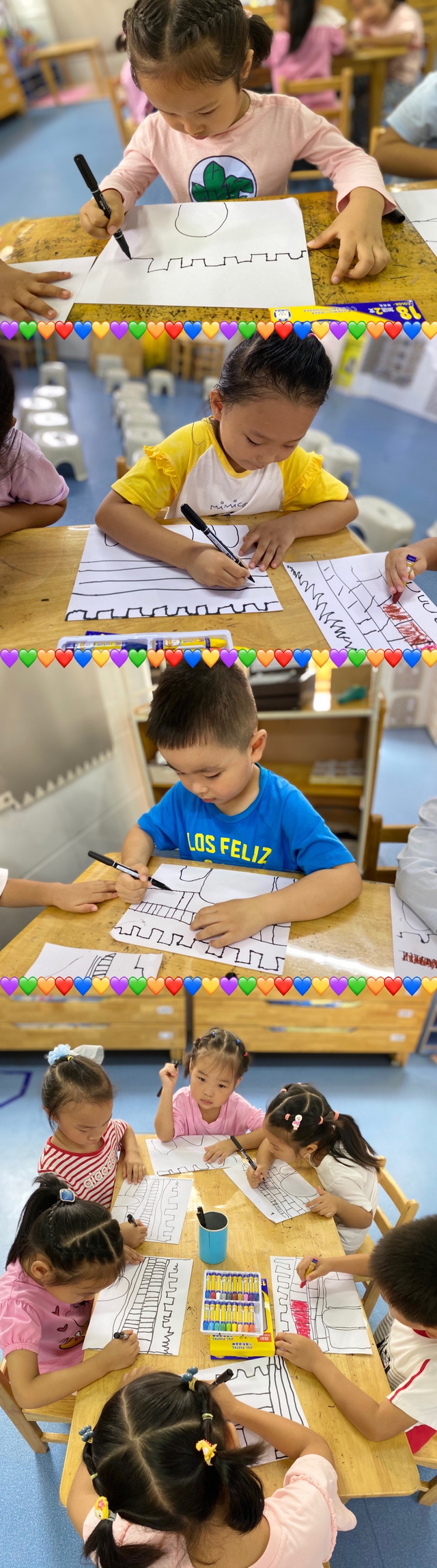 北京有万里长城,南京有明城墙,万里长城更是世界上的奇迹,是中国所仅有的,是我们中国古代人民智慧的结晶。小朋友们通过自己的理解勾画出了城墙的壮观,并通过自己的选色画出了长城的别样美。 快来让我们欣赏一下吧!