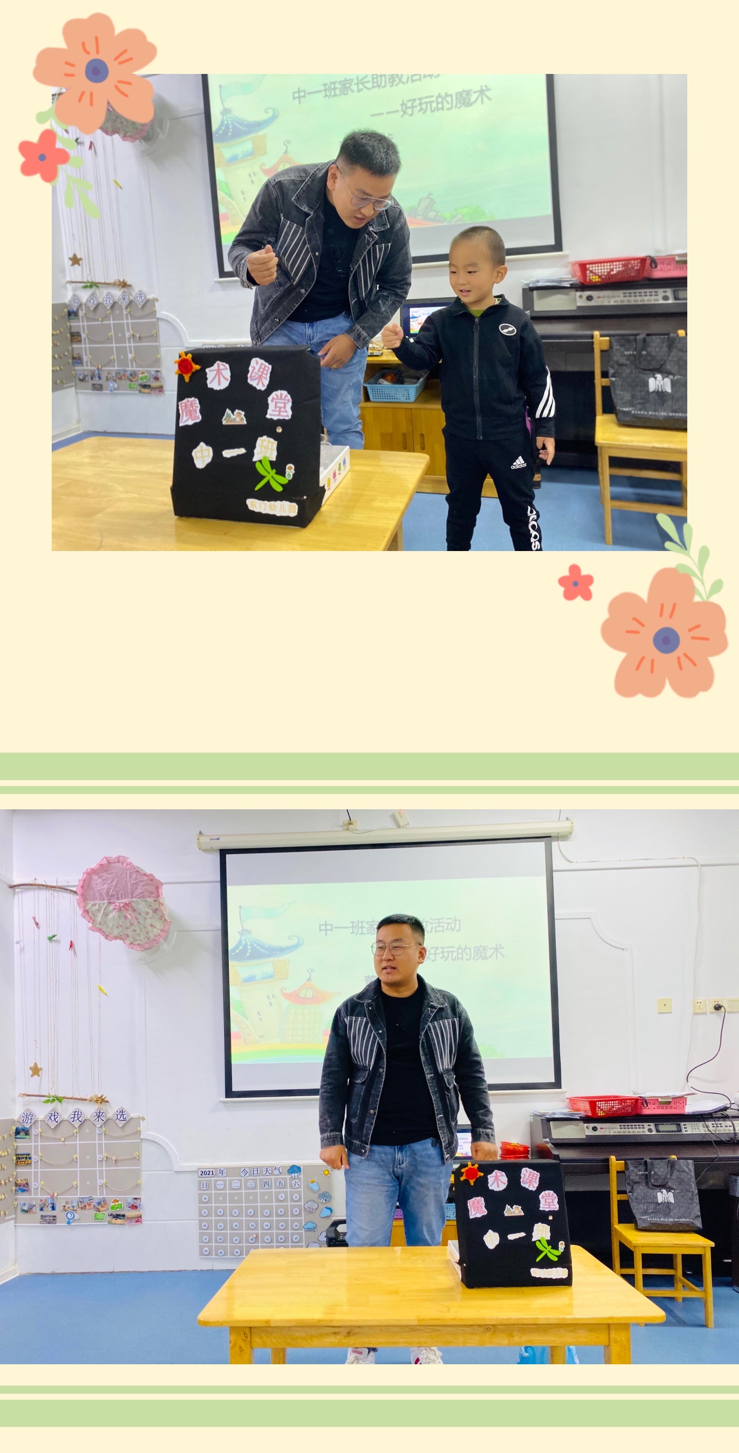 今天班级也来了一位魔术师——中1董瑞爸爸,他来为小朋友们表演并教授简单有趣的小魔术,我们赶快开启这段神奇的魔术之旅吧。