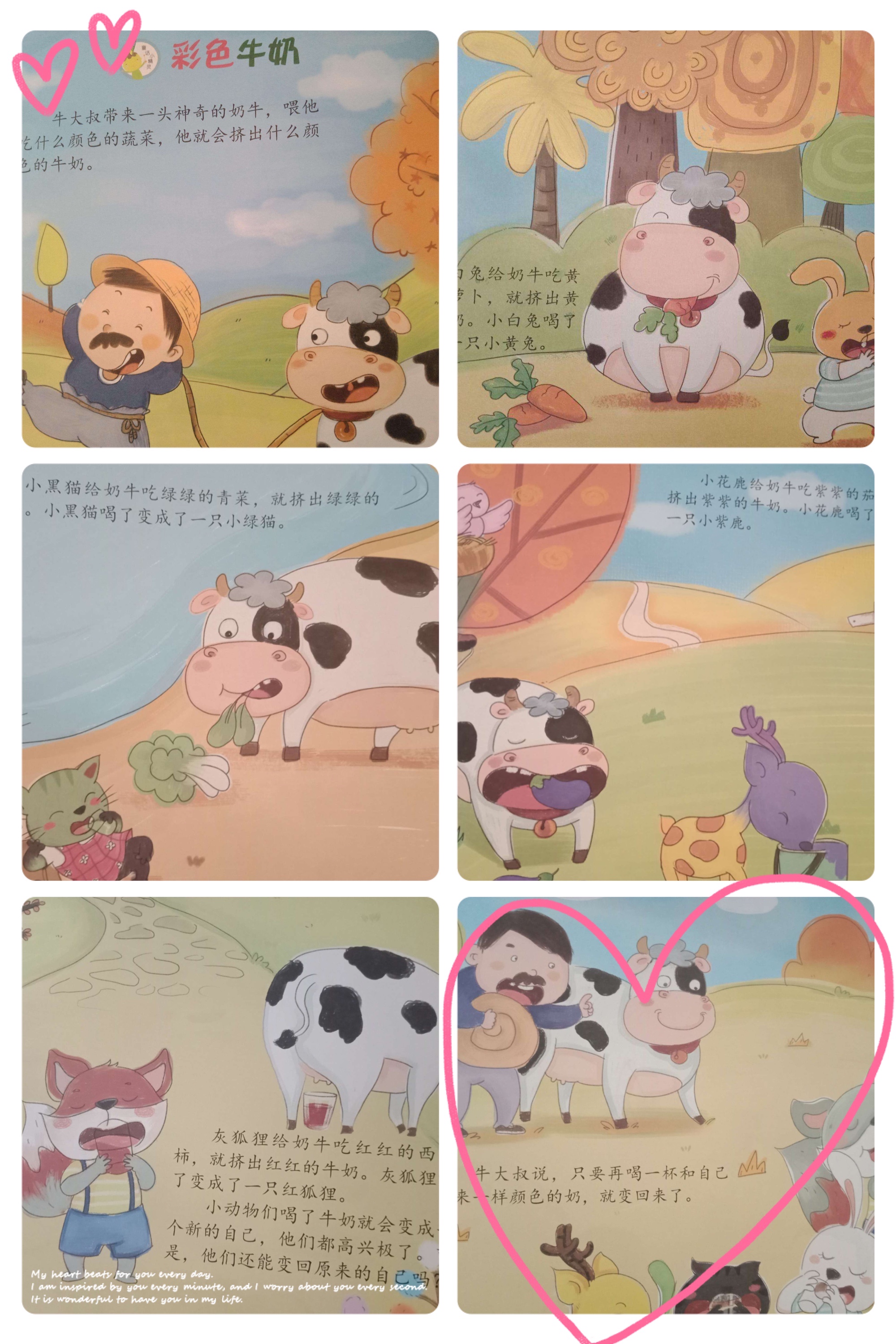 小动物们喝了牛奶就会变一个新的自己,高兴极了。可是,他们还能变回原来的自己吗?牛大叔说:只要再喝一杯和自己原来一样颜色的奶,就变回来了。从此,小动物们想变什么颜色的样子,就给奶牛吃什么颜色的蔬菜。动物世界变得五彩缤纷,更加美丽了。
