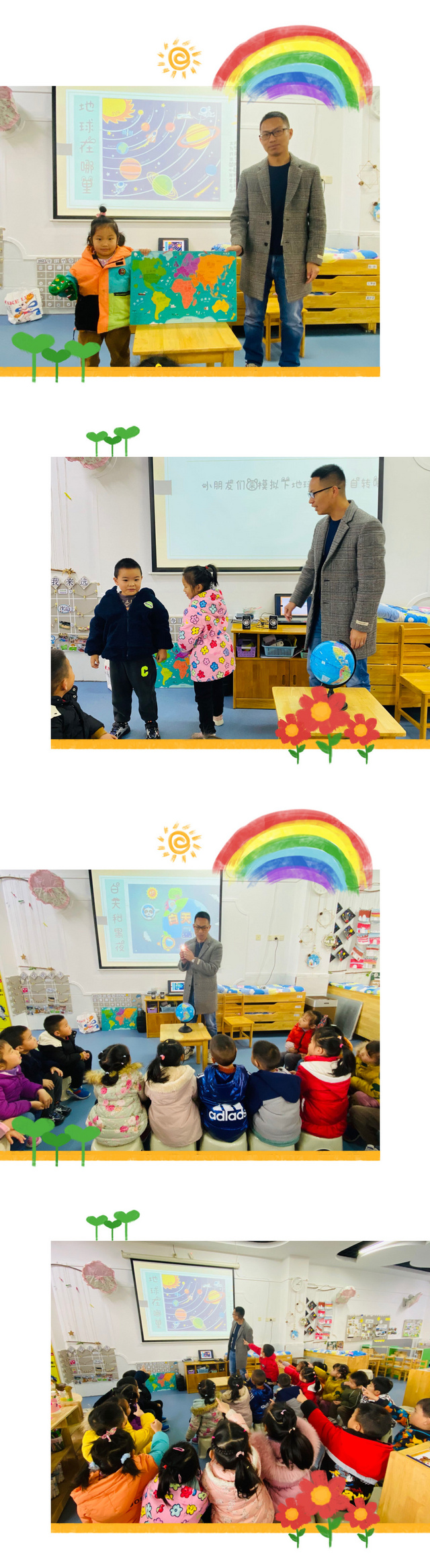 观察了地球仪后,叔叔出示了第课件图片-----“我们的地球”,生动形象的为孩子们详细介绍了我们共同生活在一个地球上、行星、以及地球的相关知识。