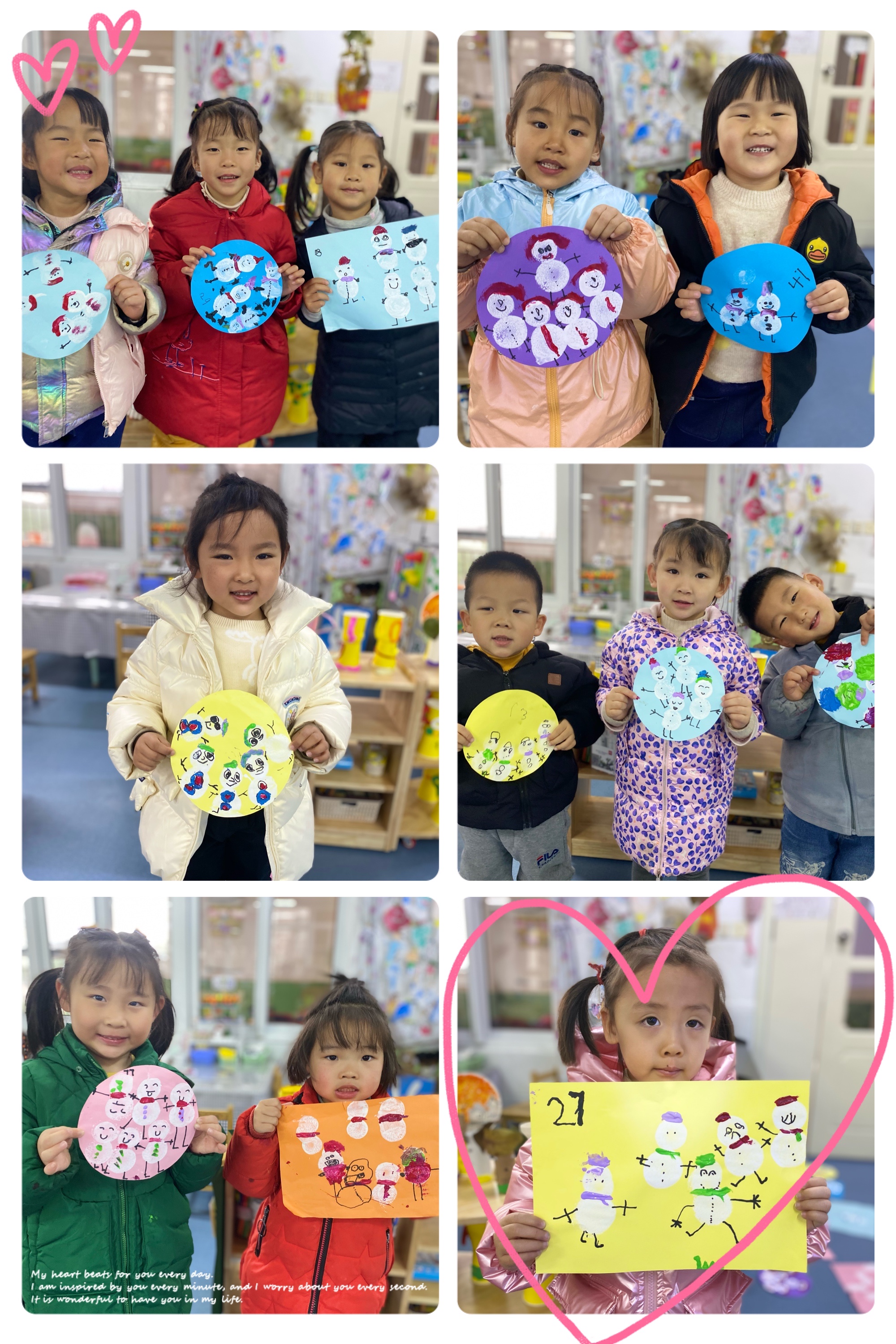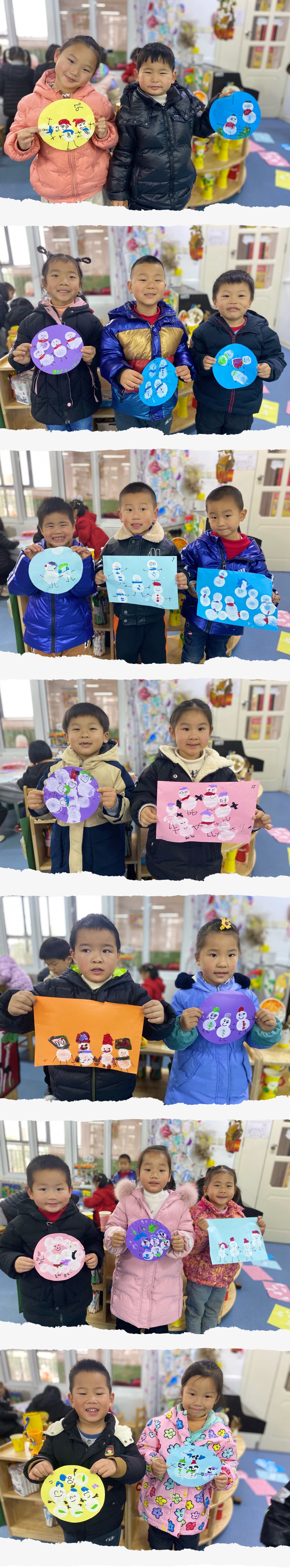 什么宝宝,怕热不怕冷?冬天到了,一起来画个雪人吧!这次我们用到了好多材料啊,有海绵沾、彩纸、勾线笔、颜料,一起来欣赏我们创作的雪娃娃吧! 我给我的小雪人做了小纽扣的衣裳!我给小雪人带了一条围巾,让她变得更漂亮了!孩子们享受创作的乐趣,沉浸在绘画雪娃娃的美术活动中。