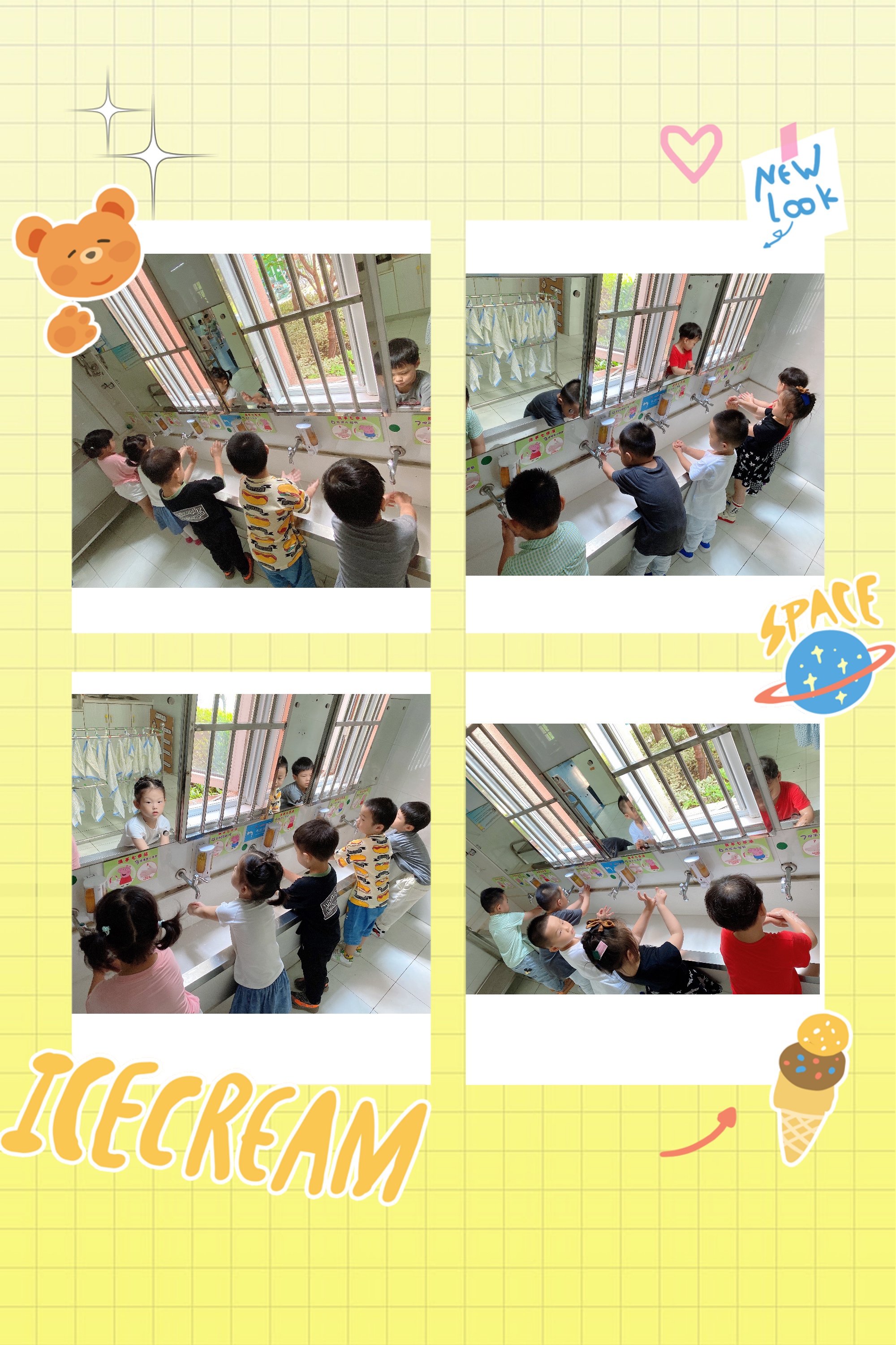 孩子们认真学习七步洗手法洗手。