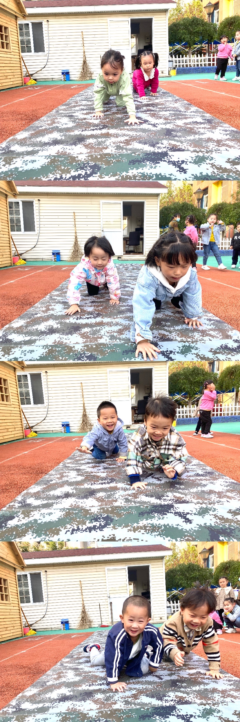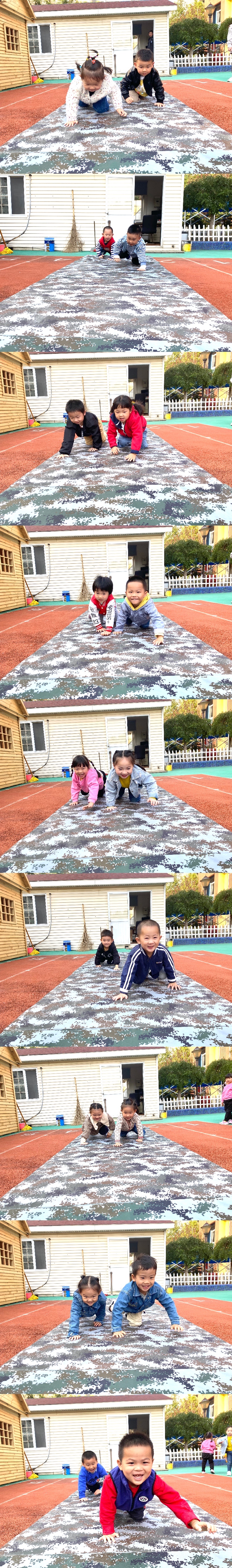 教师先组织幼儿练习爬行动作,指导正确的爬行姿势。幼儿自主选择同伴,听教师发号口令后,进行5米的爬行比赛。本次活动进行手脚着地爬行,锻炼幼儿身体的平衡与协调能力及身体的敏捷性。