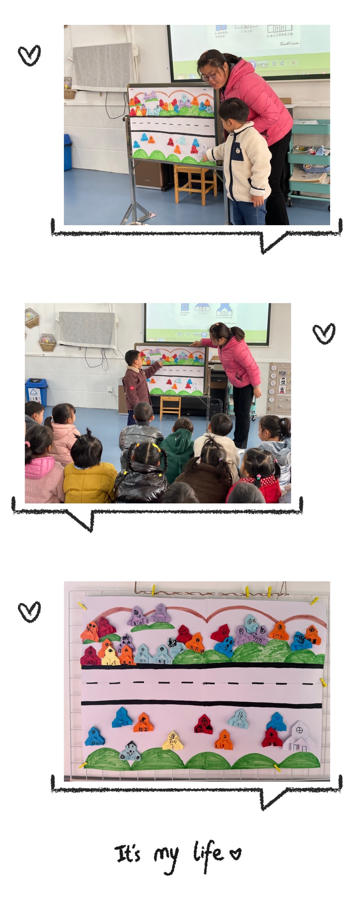 最后我们大家一起来看一看谁折的小楼最好看!你觉得谁折的好看呢?