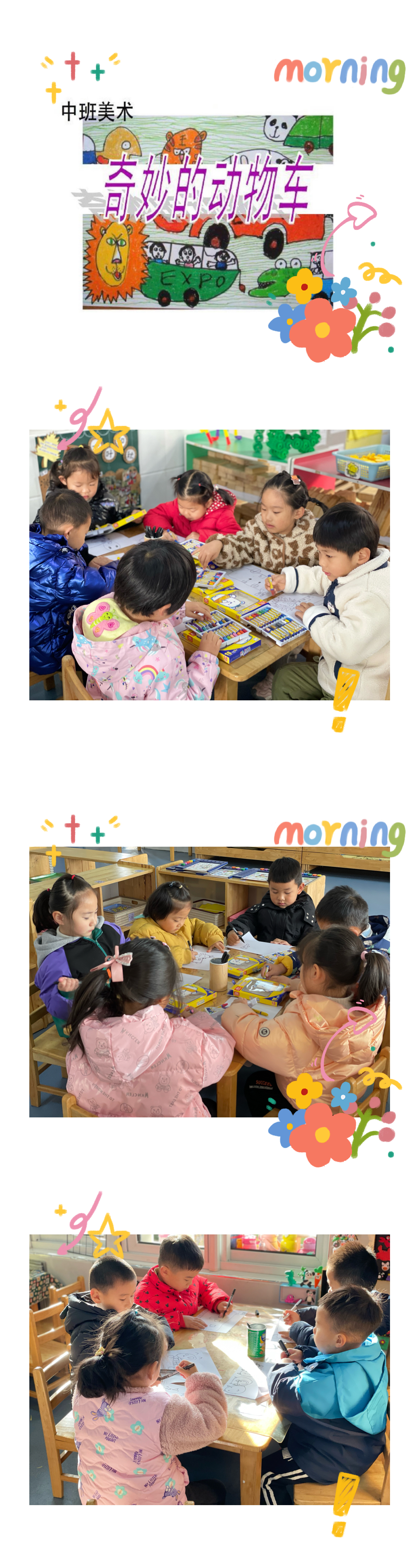 今天是一节美术活动《奇妙的动物车》,通过情境导入的方式引发孩子们讨论关于动物车的话题:猴子碰碰车、大狮子吊车、小熊汽车......孩子们根据动物的特点大胆地表达自己想做的动物车,孩子们相互讨论最终决定自己要做的动物车。