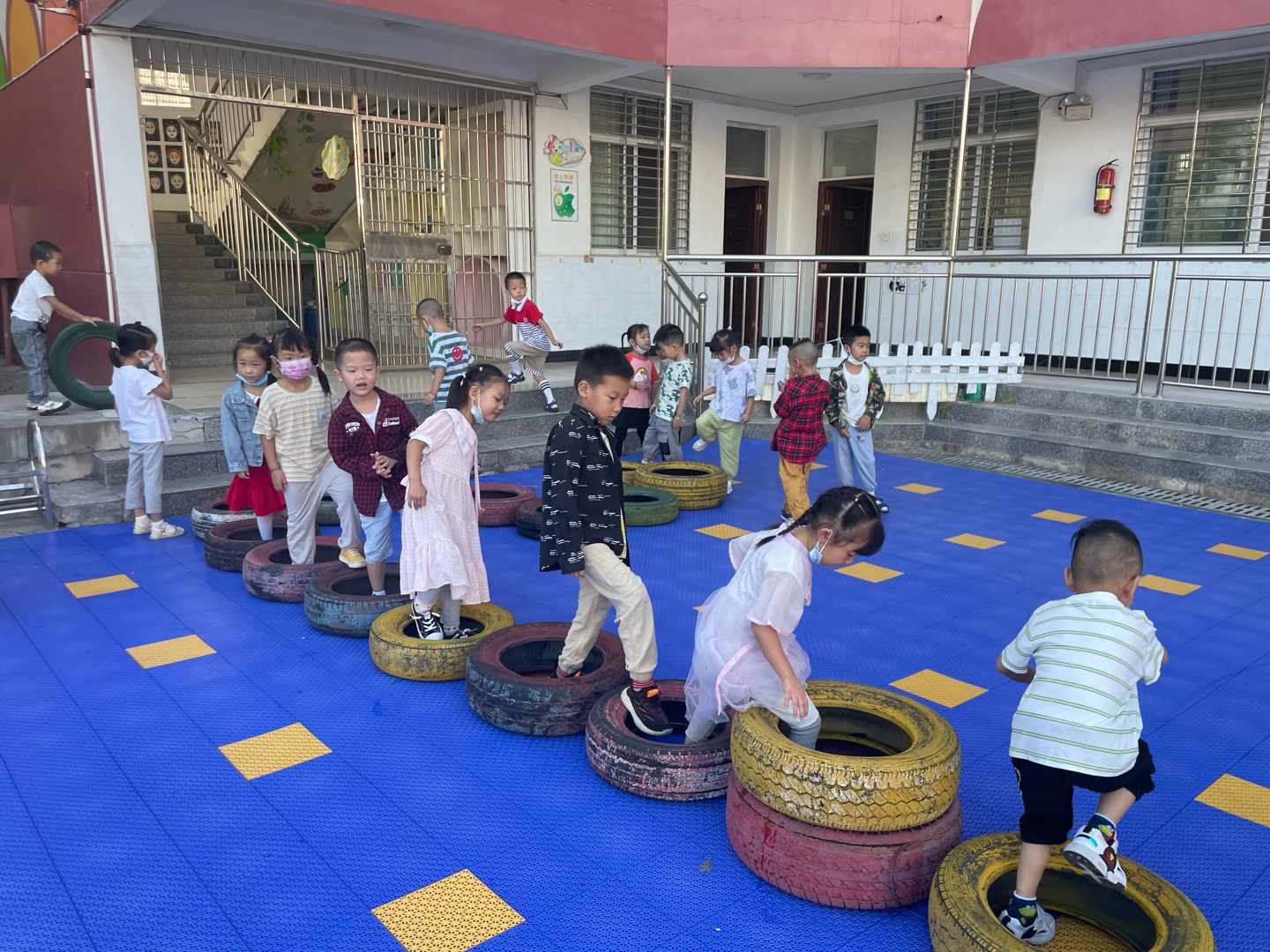 相片描述:孩子们自己选择轮胎搭建独木桥