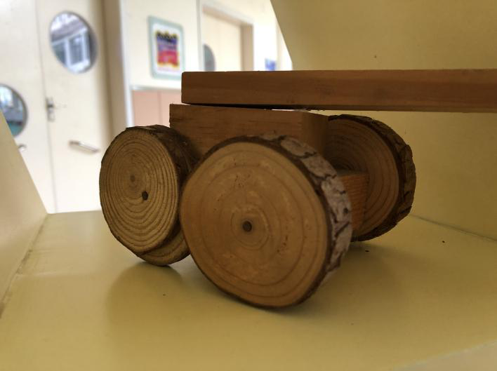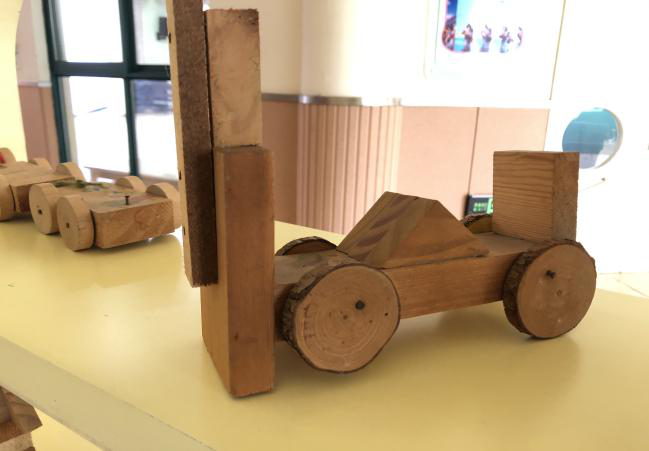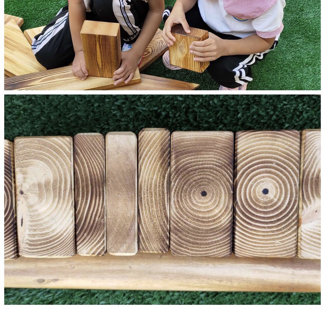 3、发现年轮。 千寻:这块木头上有圆圈圈,是花纹吗? 铭宇:我这块也有呢!颜色有的深有的浅。 教师小结:你们说的很对,树桩上的圈圈就代表大树的年龄,这些圈圈就叫做年轮,它每长一年就多一个圈,代表一岁,圈圈越多就证明这棵树越老。我们生活当中,木质的生活用品很多,那么你们就来找找更多的年轮吧! 4、幼儿带着问题和兴趣,寻找生活中和幼儿园里的年轮。 梓涵:我家的桌子上有年轮。 昊昊:幼儿园的墙壁上的是年轮吗?为什么和积木上的不太一样? 5、如何辨别年轮。 灵儿:这个年轮为什么被拉长了?梦佳:这是木纹吗? 子怡:我爷爷说这是竖着锯开的年轮。 月桐:这个木纹里面的小年轮是树杈吗?