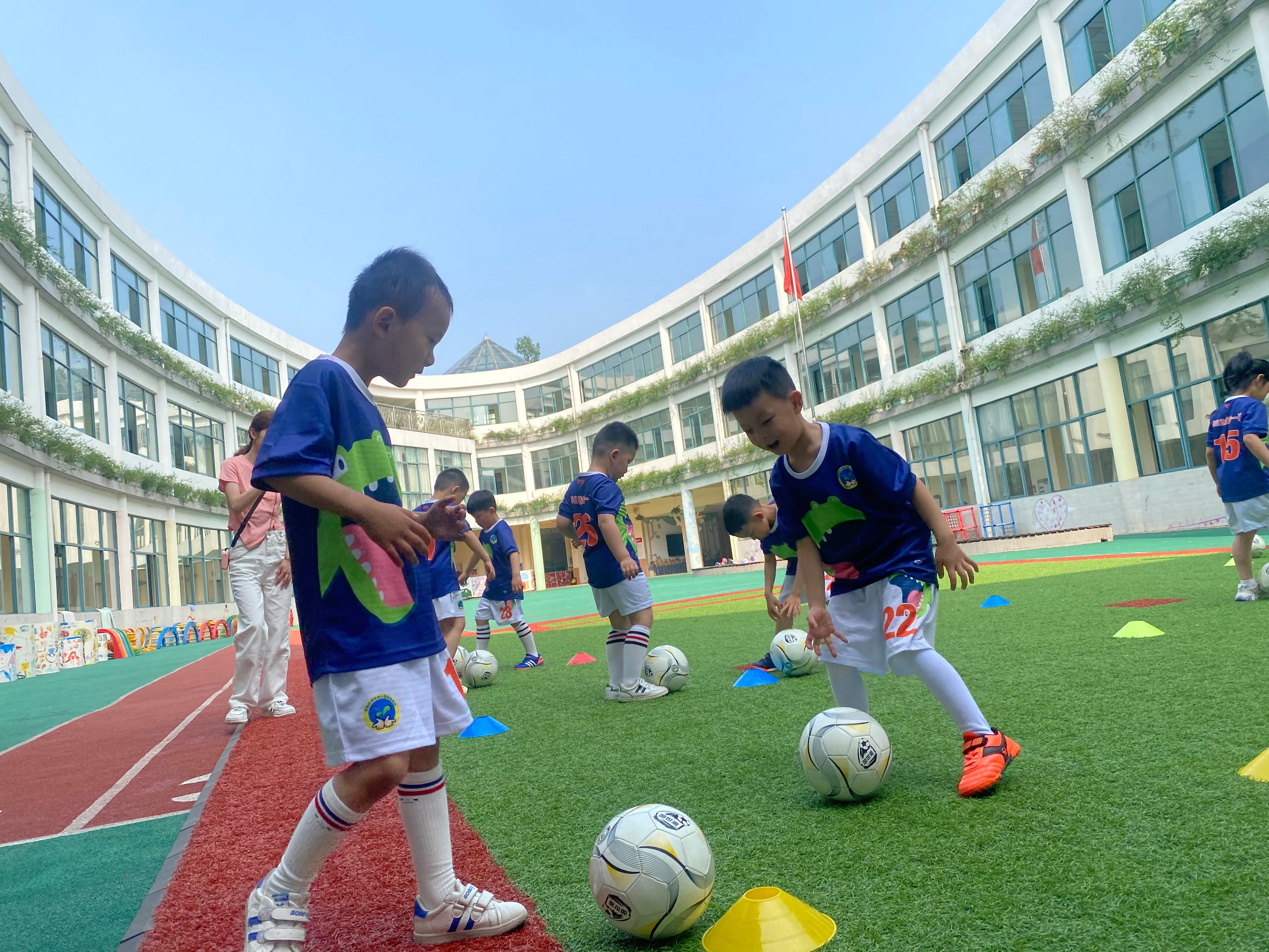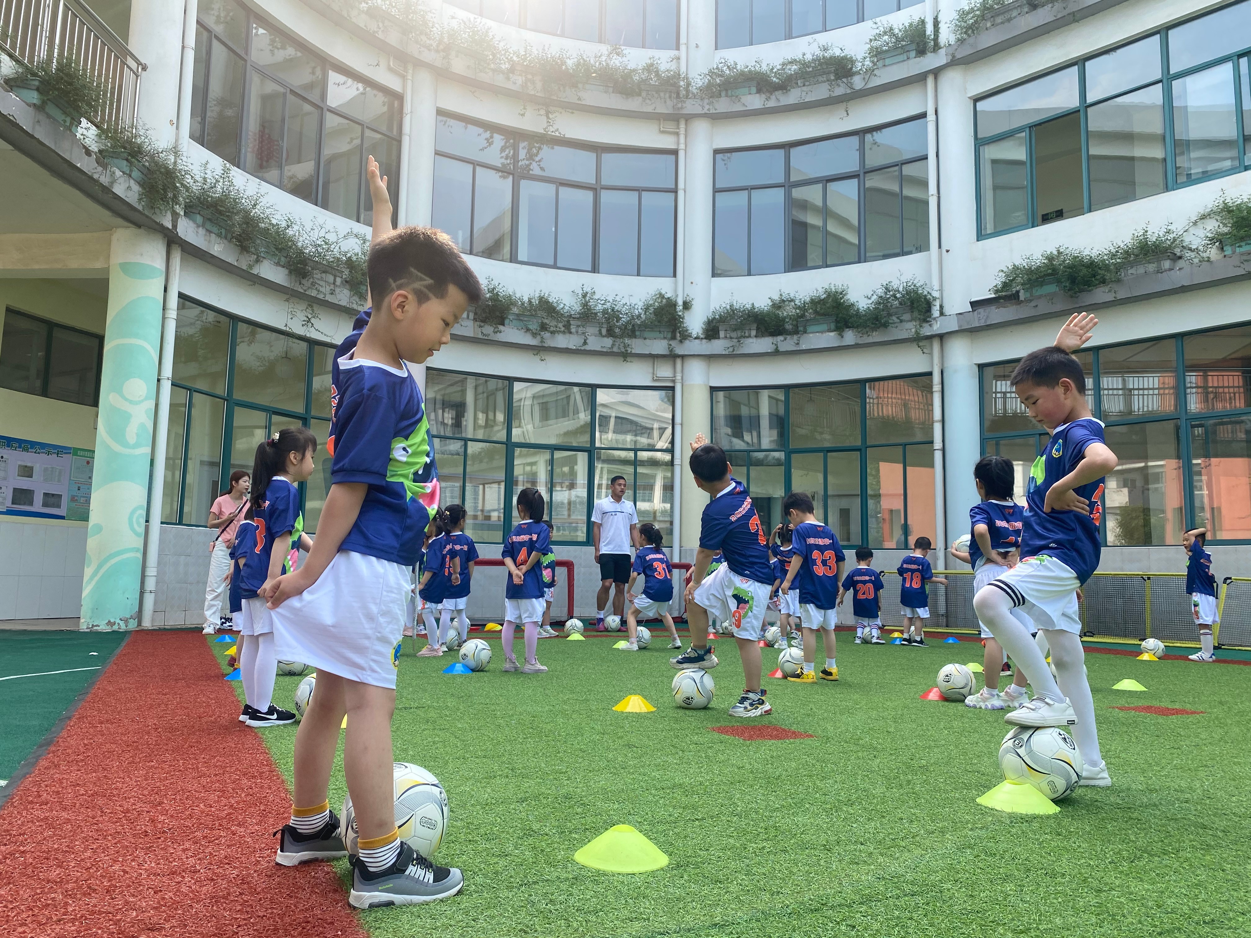 戴教练给我们上足球课不是单一枯燥的练技巧,我们的活动也是有层次逐步递进,如用脚停球,左右交替;一对一运球,点球、绕杆传球以及分组游戏等等。每个环节将运球融入游戏之中,孩子们既锻炼了身体,也愉悦的身心。活动不仅锻炼小朋友的协调能力和反应能力,还能提高身体柔韧性,而竞赛更能体会到集体荣誉感。