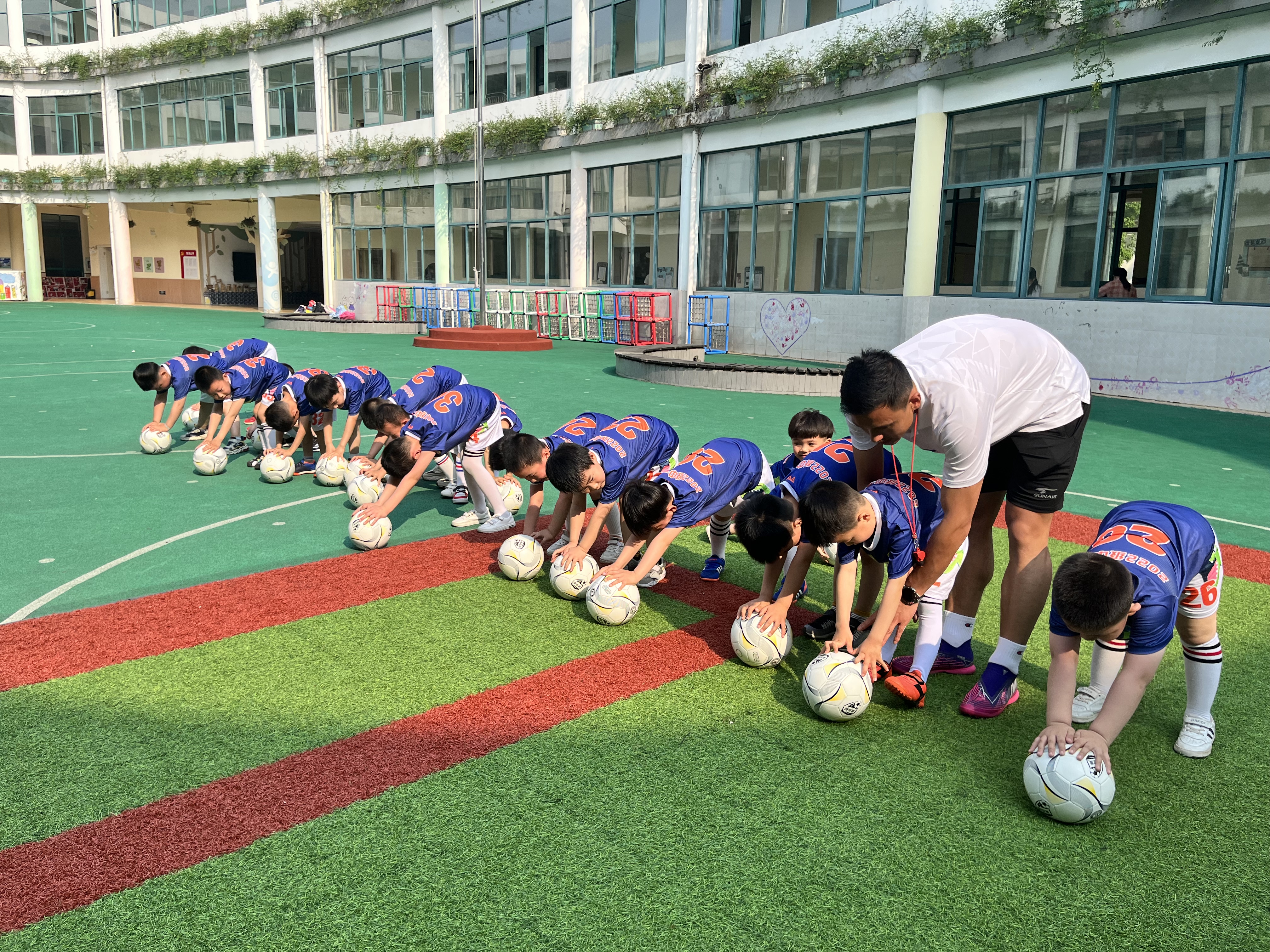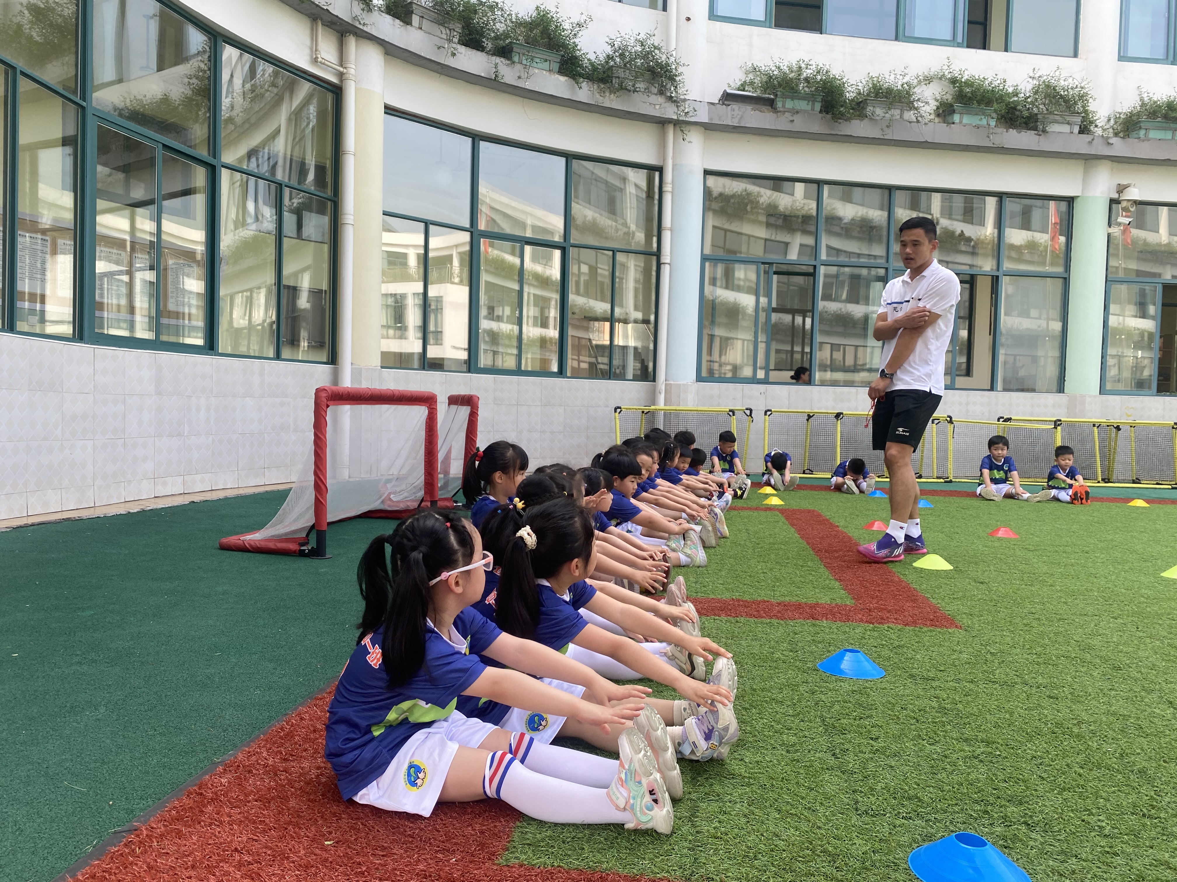 跑完五圈不要以为热身结束咯,还有继续拉伸哦。瞧,这阵仗有点舞蹈班的感觉。哈哈,拉伸完毕,我们的足球活动开始啦!