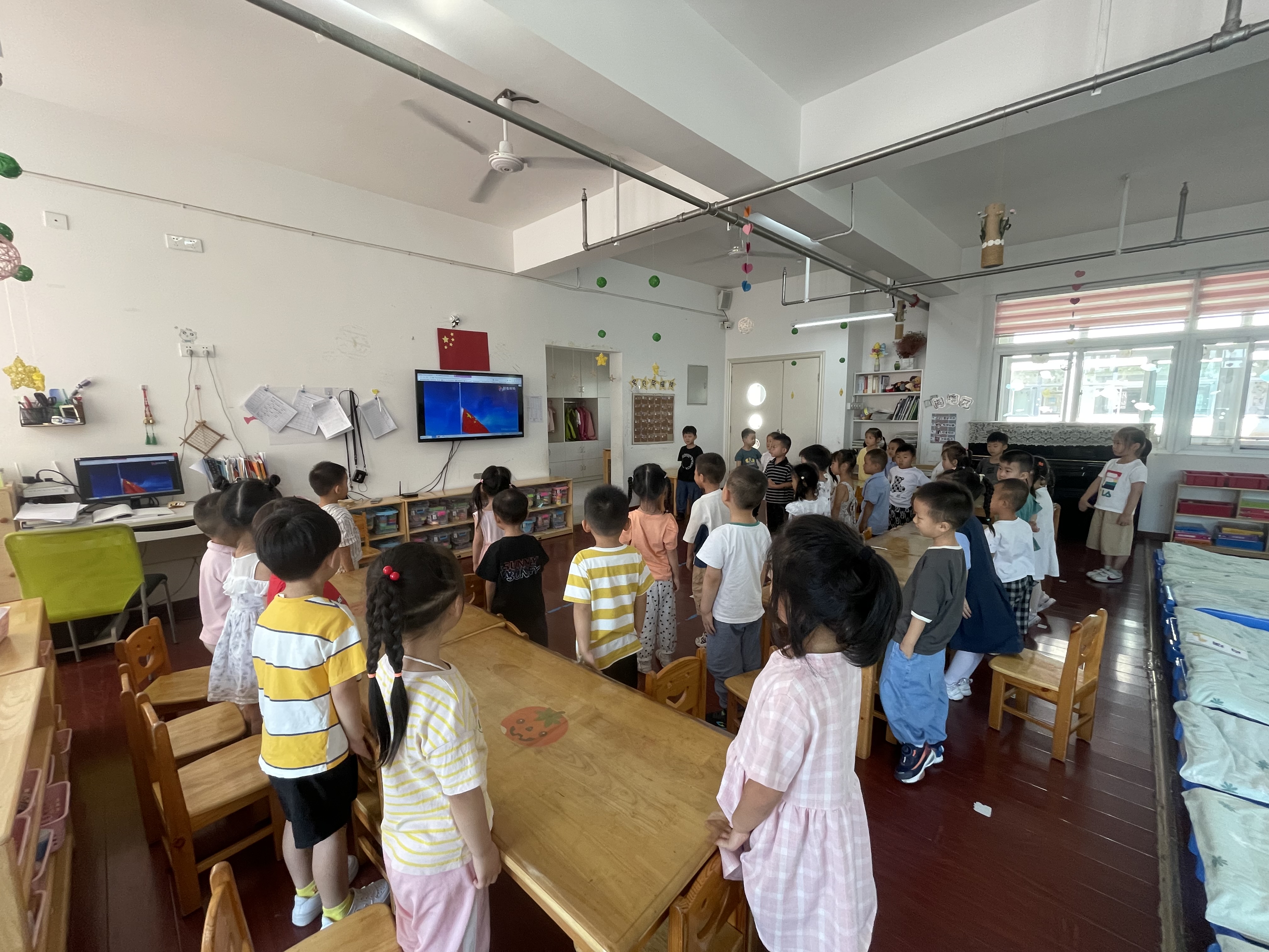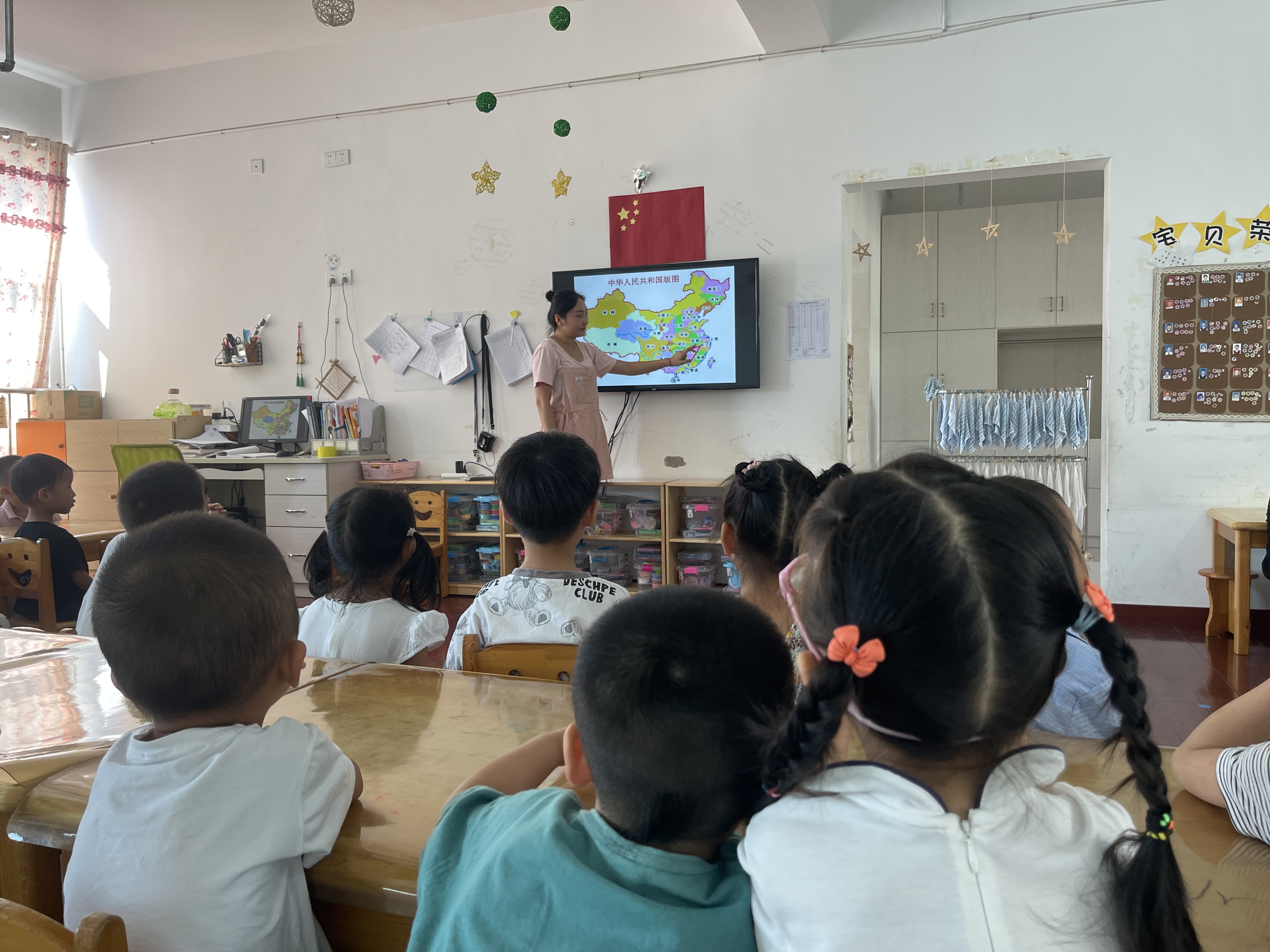 国旗是国家的一种标志性旗帜,是国家的象征,它通过一定的样式、色彩和图案反映一个国家政治特色和历史文化传统。为了让孩子们认识国旗,尊重国旗,我开展了关于国旗的两次课程——国旗多美丽(朗诵版)和国旗多美丽(歌唱版)。 在活动开展之前,我就要求孩子们和家人一起了解有关国旗的知识。因此,当我抛出问题“你对国旗有哪些了解呢?”后,孩子们纷纷举手发言“国旗是方形的、红色的”“国旗上有五颗黄色的星星,一颗大星星,4颗小星星”“国旗是解放军叔叔用鲜血换来的”“升国旗的时候要保持安静”…… 在活动中,通过图片引导幼儿掌握歌词。在通过朗诵版的学习以后,幼儿基本都能记住完整的歌词内容,而第二节的歌唱版,孩子们只要记住歌曲的曲调把记住的歌词一一对应加入进去就可以了。这首歌一共有两段,我带领幼儿边做动作边唱歌曲,利用动作来帮助幼儿理解并记忆歌词内容。但幼儿在集体演唱过程中,往往有部分幼儿会把两段歌词混在一起,唱着唱着就唱到第二段去了,或是一直在唱第一段。虽然在活动中也曾让幼儿通过倾听来发现两段歌词的异同,但在演唱时仍会出现唱错的现象。虽然一时避免不了唱错的现象,但孩子们在这首歌中懂得了要尊敬、热爱国旗,学唱歌的时候也比以往更加认真、严肃。 通过这节活动课,孩子们感受到了国旗的美丽,知道了祖国的伟大,增强了“我是中国人”的自豪感,培养孩子们的爱国的情怀。