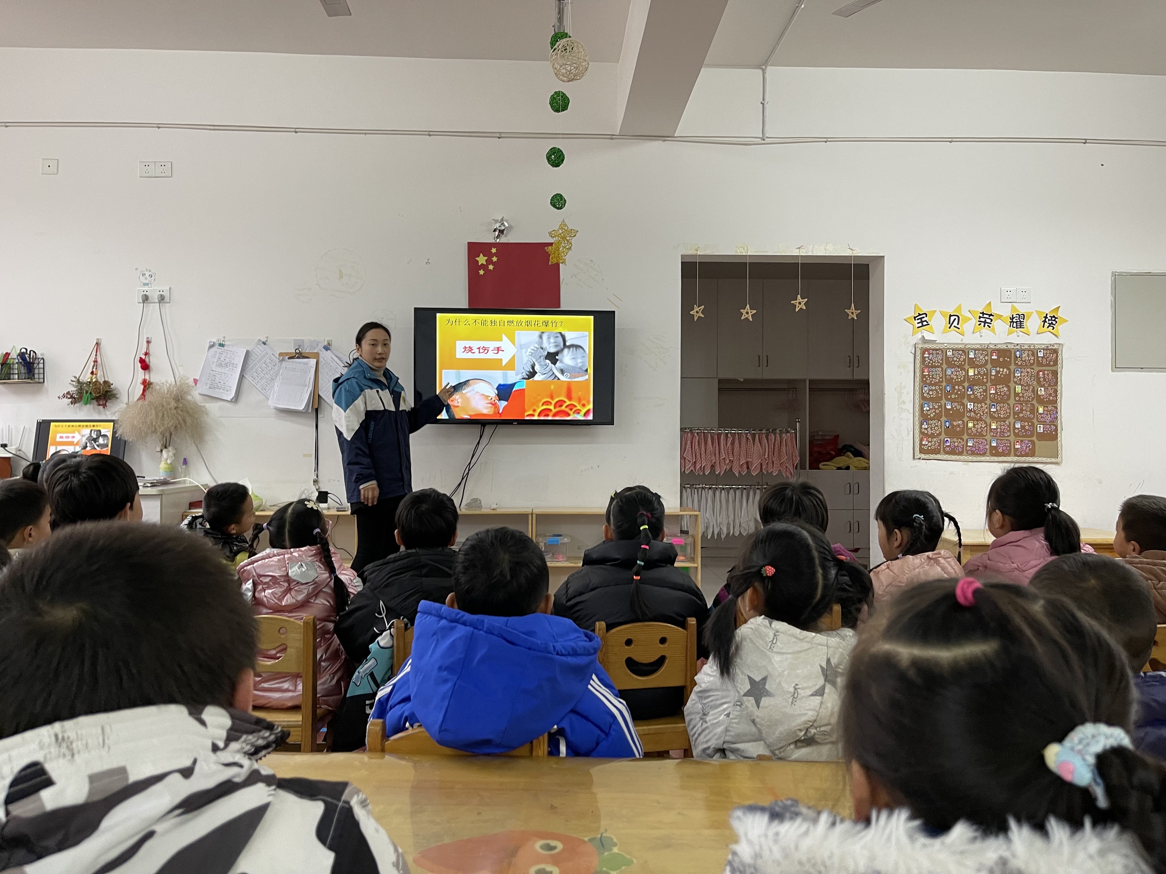 孩子们盼望的一年一度的寒假生活即将开始,为使幼儿欢度一个愉快的假期,我们对孩子加强了安全教育,让小朋友进一步了解了放寒假期间的放鞭炮、交通、饮食、用电等安全知识,为度过一个安全、快乐、有意义的寒假做好铺垫,增强幼儿的安全防范意识,提高幼儿的自我保护能力,使幼儿过一个愉快的寒假和春节。 我们精心准备的PPT及视频,让孩子们更加直观的了解假期要注意的各项安全。 1、注意通行安全。会走行横道和人行道,过马路时会看红绿灯,会跟着大人走,过马路时不疯打、疯跑,不独自一人横穿马路。认识一些简单的交通安全标志。 2.注意用电安全。认识电源插座,不用手或导电物(如铁丝、钉子、别针等金属制品)去接触、探试电源插座内部。 3.注意燃放烟花、爆竹安全。不自己燃放烟花、爆竹,不用鞭炮玩打“火仗”的游戏,这样很容易伤人,在大人燃放烟花、鞭炮是,站在距离其远些的安全地带。 4.注意饮食卫生。不吃过量的零食,在家饮食要规律,按时吃饭,不挑食,多吃蔬菜。 活动中孩子们知道了只要我们处处小心,注意安全,掌握自救、自护的知识,锻炼自己自护自救的能力,机智勇敢的处理遇到的各种异常的情况或危险,就能健康地成长。 祝小朋友们过一个安全、健康、愉快的寒假,同时祝小朋友新年快乐、平安幸福!