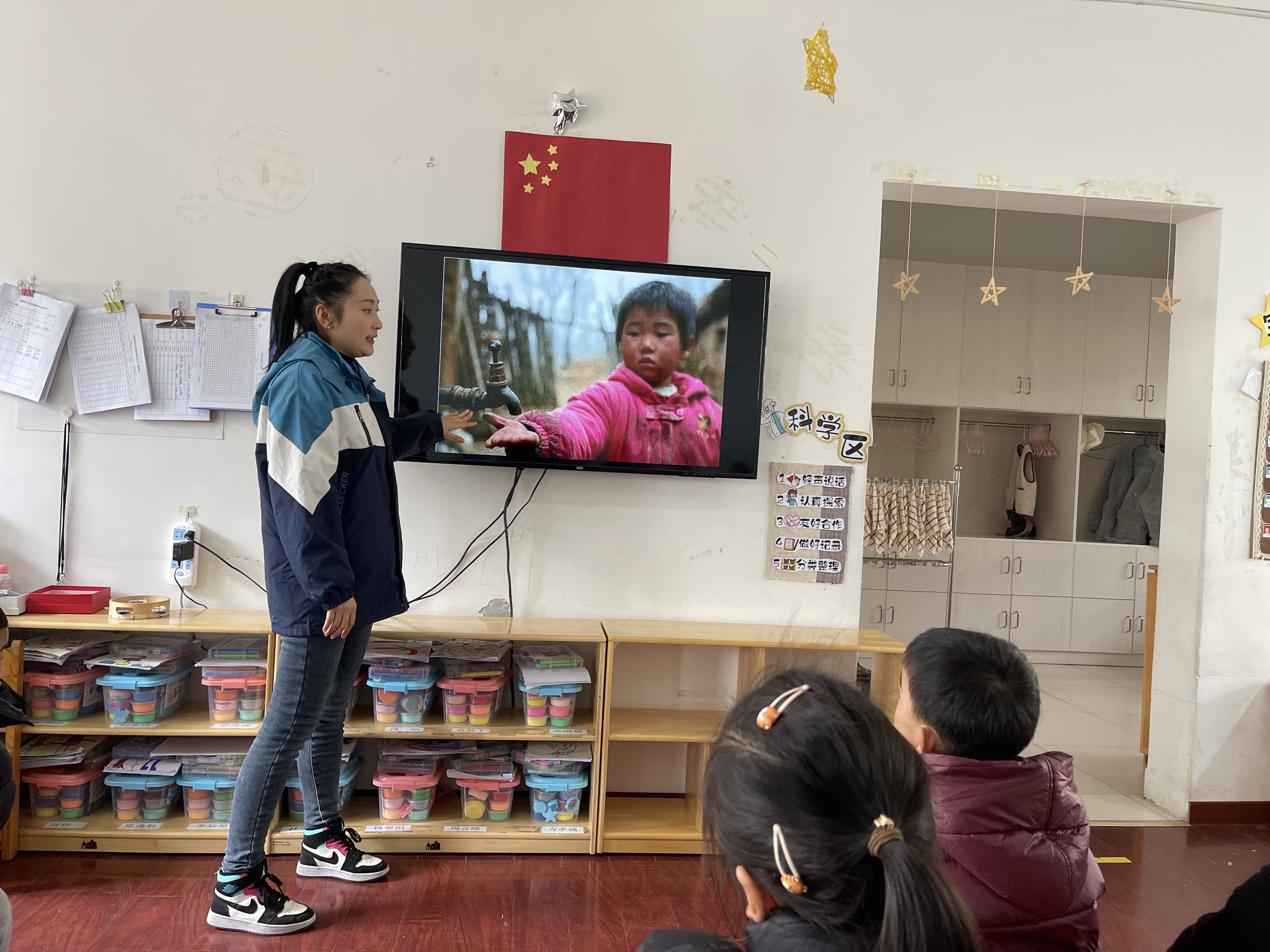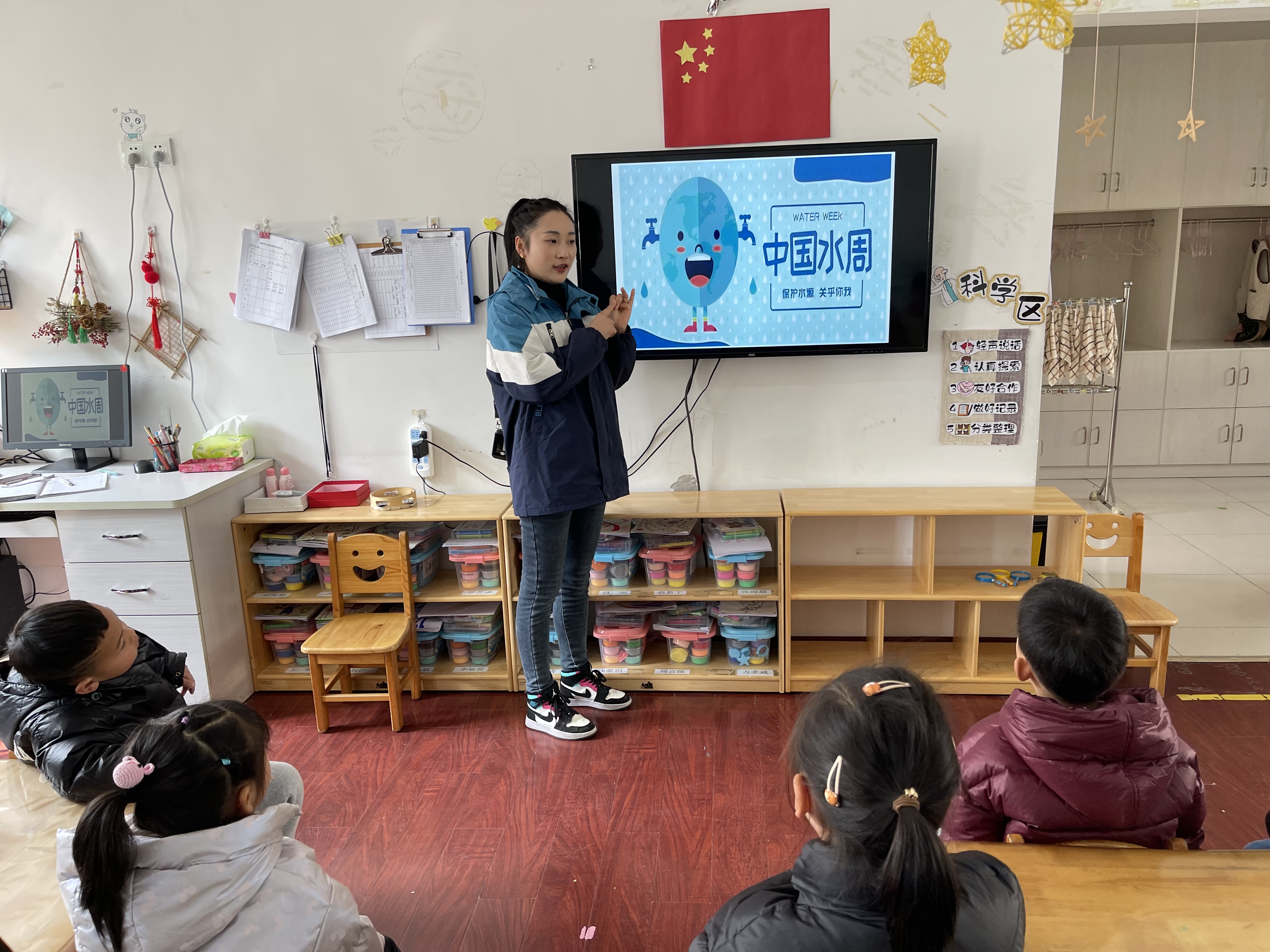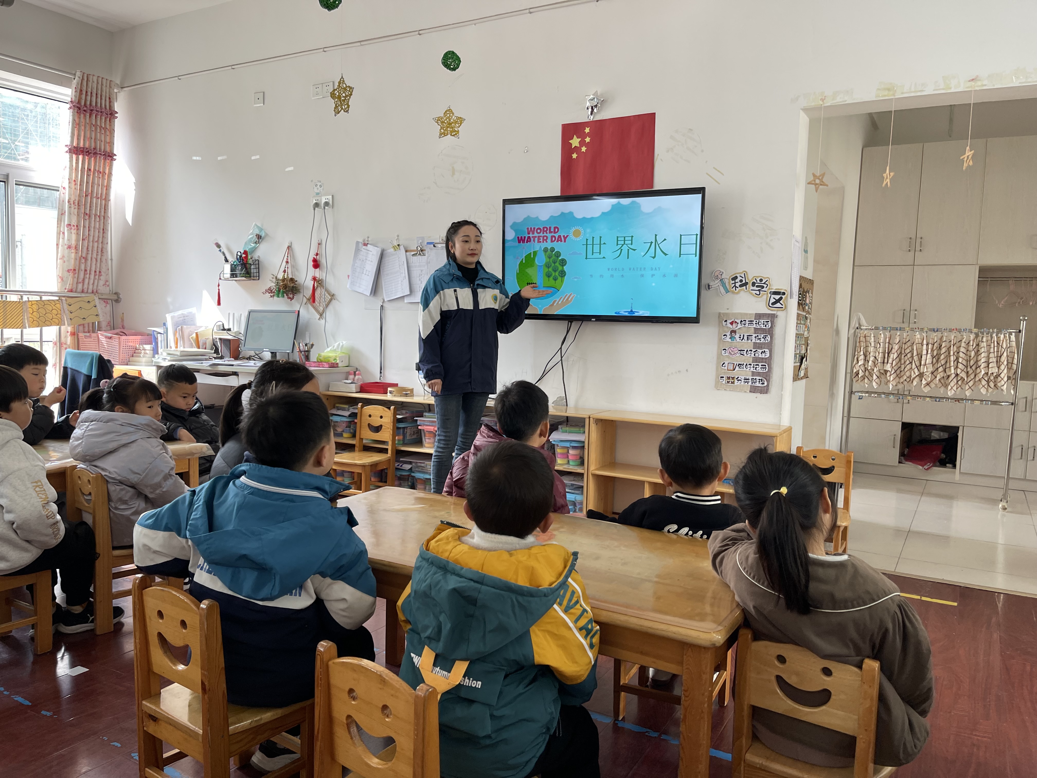 水是世界上最宝贵的资源之一,每年的3月22日是世界水日,3月22日到28日的定为中国水周。在第35届中国水周到来时,为了让幼儿了解世界水日,认识国家节水标志。更加深刻的认识到缺水给我们的生活生产带来的不方便,知道节约用水是勤俭节约的好习惯。并让幼儿学习一些节约用水的方法,能在生活中努力做到节约用水,向身边的人宣传节约用水,催促自己的家长节约用水。我在班级开展了以“世界水日”为主题的活动运用了多媒体课件进行教学,用PPT出示大树因为缺水枯槁而哭泣的图片,并以:“大树为什么哭了?”引出课题。 活动中我带领幼儿认识了节水标志。提出“什么时候会用到水?”的问题,并补充介绍除了我们生活中需要水,动物,庄稼,工厂生产都离不开水,并用多媒体展示相关图片。结尾处我播放了我国西南地区大旱视频材料,使幼儿在情感上产生了共鸣,加深了幼儿对水的重要性的认识。 活动最后,孩子们纷纷表示自己要做一个“节水小卫士”,主动节约用水并向身边的朋友家长宣传节约用水的知识。