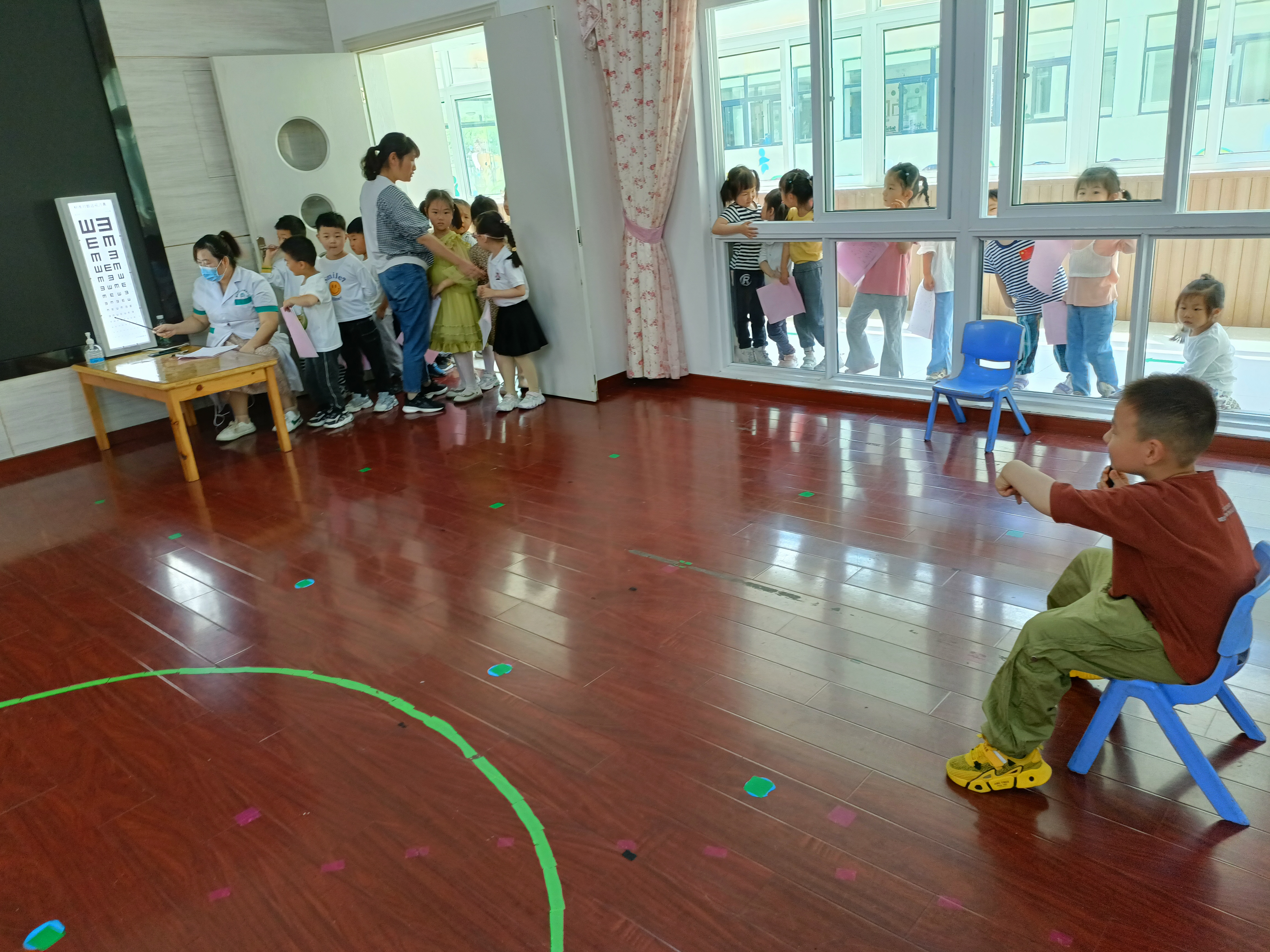 幼儿定期体检是幼儿园健康教育的重要组成部分,《3—6岁儿童学习与发展指南》中指出:发育良好的身体、愉快的情绪、强健的体质、协调的动作、良好的生活习惯和基本生活能力是幼儿身心健康的重要标志,也是其它领域学习和发展的基础。5月25日,繁阳社区服务中心的医生来为孩子们进行了一年一次的健康体检。 眼睛是心灵的窗户,视力测查是儿童保健非常重要的项目,儿童的视力处于一个动态发育的过程中,筛查可以早期发现如先天眼病、弱视、斜视等问题,及时干预治疗,促进视力功能的良好发育。我们要保护好自己的眼睛,多吃胡萝卜和蔬菜,少看手机和电视哦。