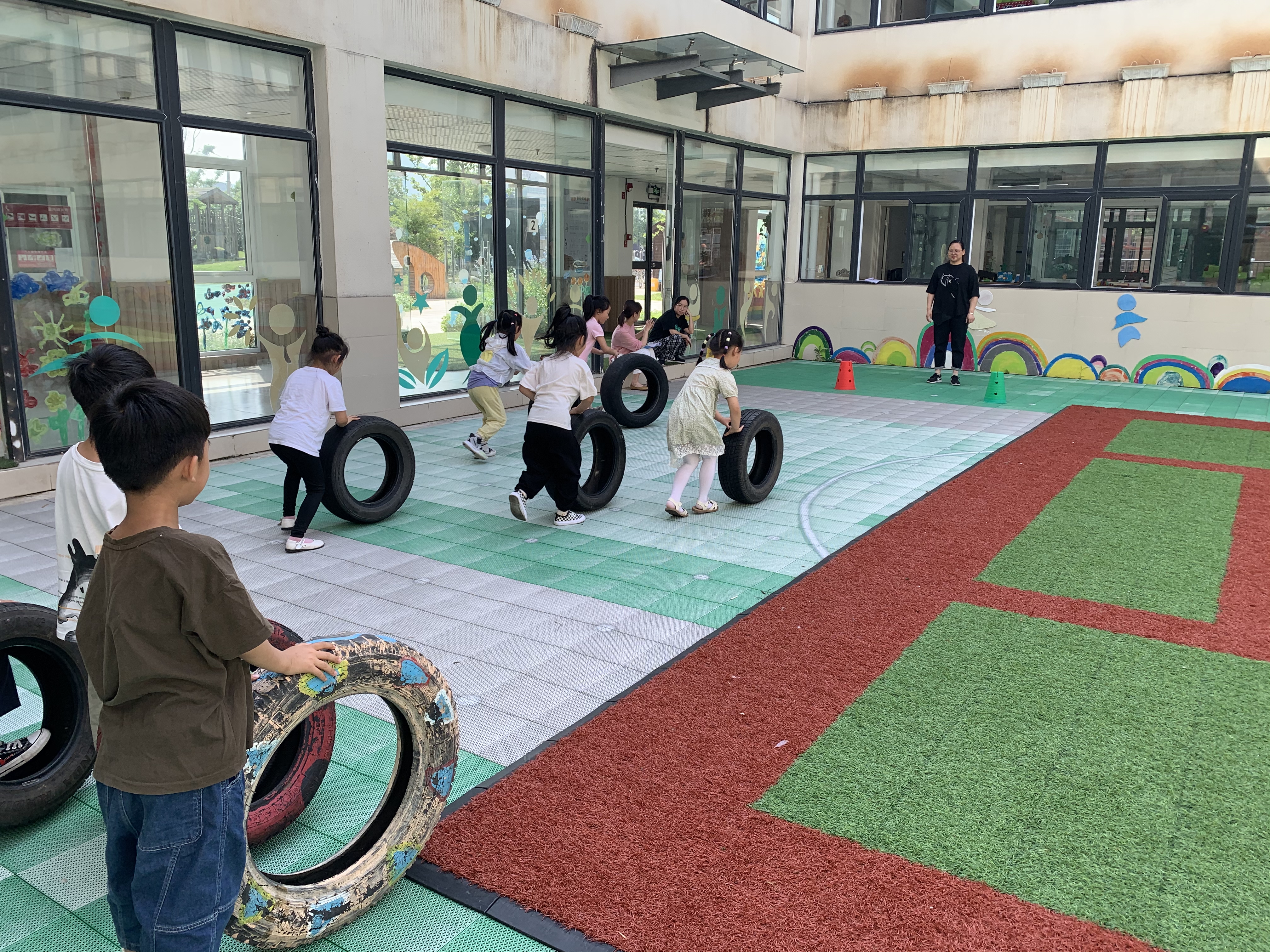 教学反思: 这节中班健康活动趣味轮胎的活动目标是锻炼幼儿的上肢力量及动作的协调性,让幼儿在玩轮胎的过程中积极动脑筋想出各种玩的方法,发展幼儿的创造力和想象力。在游戏中练习平衡、钻爬和推拉的基本技能等,平衡练习、滚动练习、翻滚练习、搬运练习以及翻越练习,每个环节都围绕着教学重难点来进行,发展幼儿上肢动作和力量,发展幼儿身体的协调性和灵活性,并让幼儿享受到玩轮胎游戏的乐趣。 轮胎既是孩子们在日常生活中常见的,又是孩子们不容易玩到的材料,轮胎在园里闲置许久,利用率偏低,且在幼儿园的日常活动中,我们都缺乏对幼儿上肢力量锻炼的活动。所以设计此次活动目的是不要忽视对幼儿上肢力量的锻炼,以后能提高轮胎在教学及日常活动的运用。 在让幼儿自由玩轮胎的环节中,我明确的提出了注意安全的要求,并对幼儿玩轮胎的方式进行了简单的总结。在进入第一个环节平衡练习让幼儿走轮胎时,我明确提出了滚轮胎应该注意的事项及安全要求,在滚动练习中我要求幼儿用最简单、省力的方法来把轮胎搬运到活动场地,大部分幼儿都能用滚轮胎的方式来完成,但有一个是抱着走,我也及时的对滚轮胎是最简单省力的进行了总结。在进入第二环节滚轮胎游戏比赛,我分男、女两组进行比赛滚轮胎,我都明确的提出了要求,整个活动过程比较紧凑,强度较大,对幼儿的体能提出了较大的挑战,在完成所有比赛后,带领幼儿进行了放松活动并进行了总结:知道了滚轮胎是最简单省力的方法。 幼儿游戏活动是在与材料相互作用中主动学习和发展的,趣味轮胎活动是根据幼儿的身心特点,选择幼儿日常易见的废旧轮胎作为活动器械,并激发了幼儿对活动的探索欲望,从而使幼儿在游戏中主动尝试,大胆想像,创造性地发现了多种玩法。在活动中,能与同伴商量合作玩,并体验到一起玩的快乐,对中班幼儿来说是一件不容易的事。通过这个活动,幼儿在自由探索的时间和空间中,在自由合作游戏中,发现和创造出了新的玩法。在自由选择及学习活动环节中,孩子们得到是一种对体能的挑战。