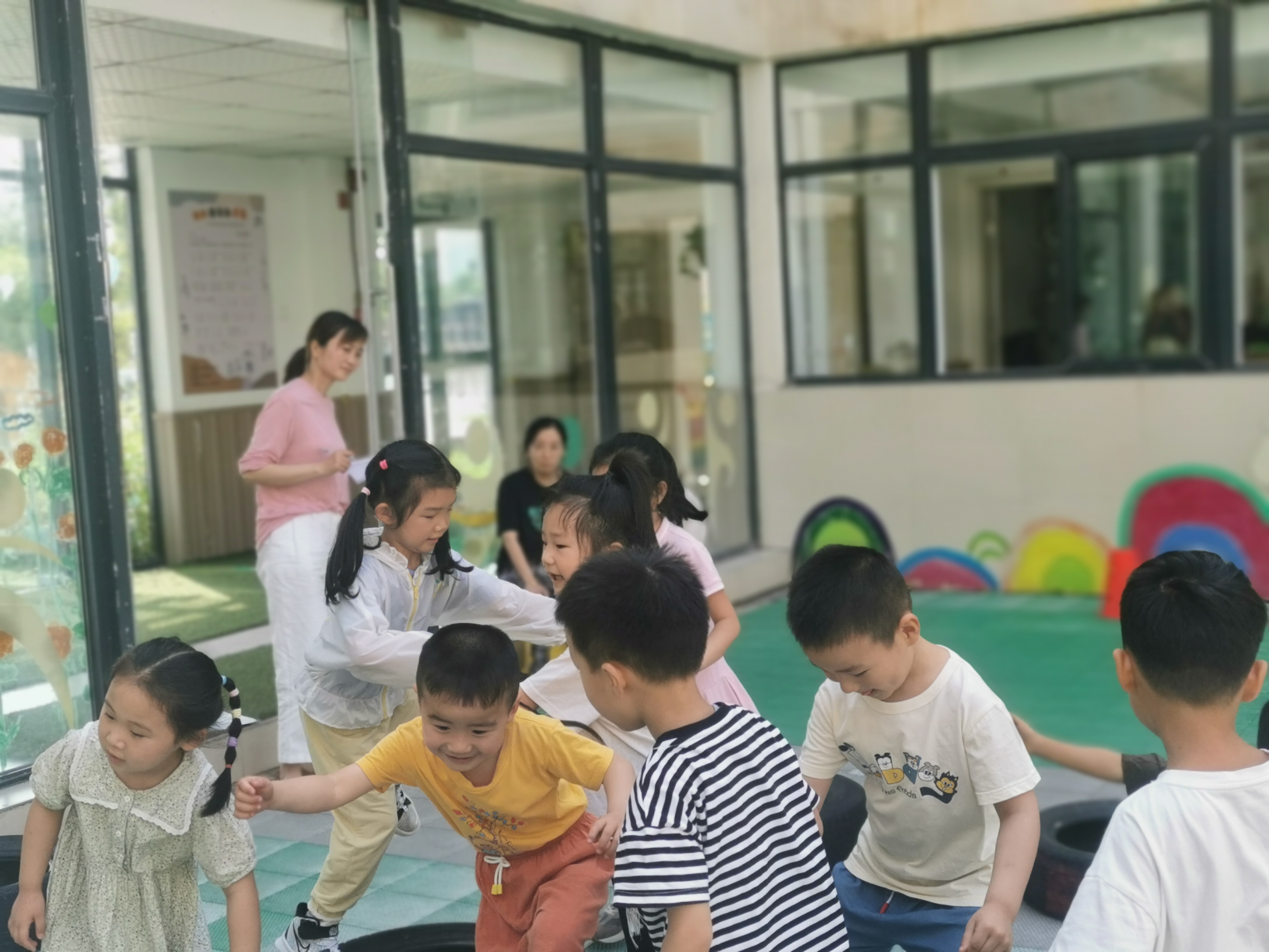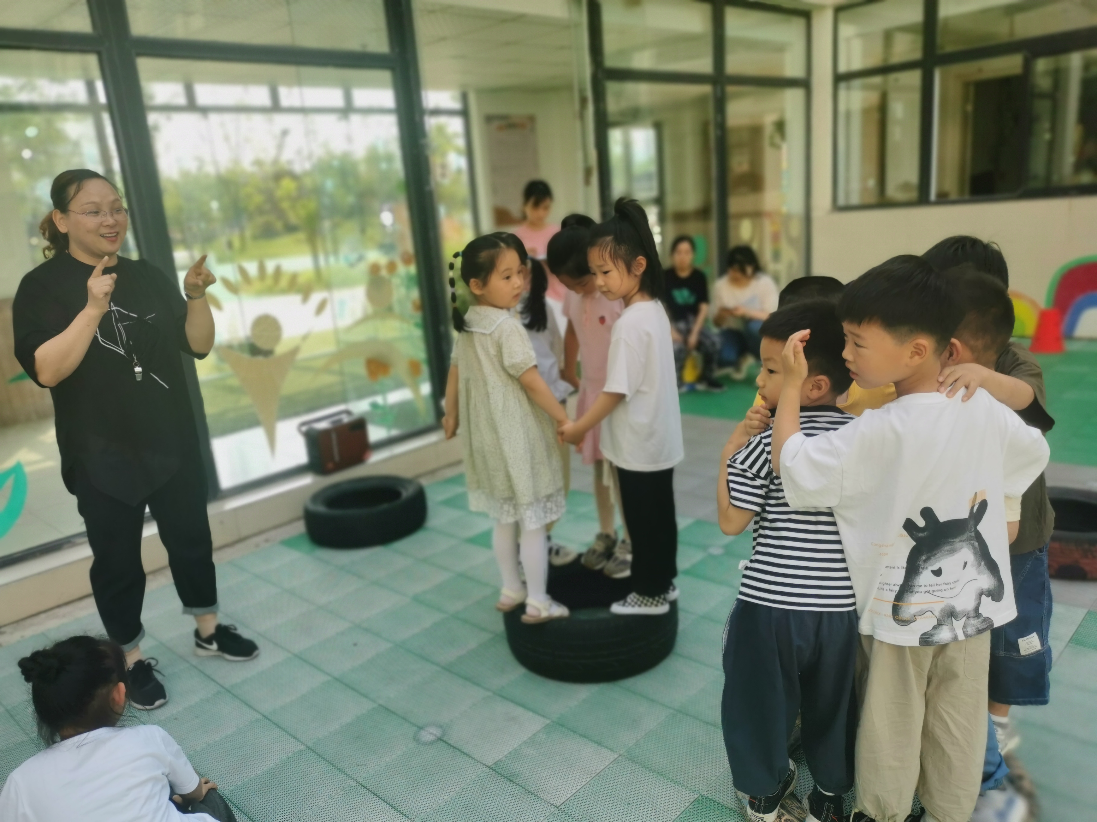 活动目标: 1.练习平衡、钻爬和推拉的基本技能,发展幼儿上肢动作和力量。 2.享受玩轮胎游戏的乐趣,发展身体动作的协调性和灵活性。 3.培养幼儿的竞争意识,体验游戏带来的挑战与快乐。 活动准备: 轮胎若干、音乐、宽阔的场地、贴纸。 重难点: 掌握玩轮胎的基本动作技能,体验轮胎游戏带来的乐趣。 活动过程: 一、导入 1、自由探索 师:小朋友,看老师今天给你们带来了什么好玩的?(轮胎),你们以前玩过轮胎吗?(玩过)下面请小朋友自由玩轮胎,可以拿起来玩,一定要注意安全。 2、热身活动 师:停,现在请小朋友们一人站在一个轮胎里,和老师一样,眼睛看着老师,站好,手掐腰,跟着老师一起做。在音乐节奏下带领幼儿活动肩膀,头部,胳膊等部位。 二、探索活动 1、自由探索轮胎的多种玩法。 2、交流分享新玩法。 3、平衡练习 (1)用轮胎摆桥 师:小朋友,老师用轮胎给你们摆了一座小桥,现在我们来过小桥,过桥时小朋友一定要注意安全,不要推,不要扯别的小朋友的衣服,完成后回到原来的地方。 (2)把一个轮胎立着放在其中一个轮胎上,让幼儿爬着过去。幼儿过小桥时,老师在旁边辅助。 4、滚轮胎比赛 师:过完了小桥,老师想请小朋友们用最简单,最省力的方法把轮胎运动老师身边来。刚才小朋友是怎样拿轮胎的呢?(拖,滚,抱着,抬着)那什么方法是最省力的呢?(滚轮胎)对了,滚轮胎是最省力的方法,那我们来比赛,看谁的轮胎滚得快,比赛时一定要注意安全,不能砸到其他的小朋友。 5、教师小结游戏评价:优先完成游戏的幼儿,奖励小贴纸。 6、翻滚练习: 教师示范让轮胎翻跟头,幼儿一起让手中的轮胎翻跟头,从场地的一头翻到场地的另一头。 7、挑战与学习 (1)交代挑战小山的要求与跳的方法。 (2)幼儿自由选择组成三个小组进行游戏。 (3)幼儿重新进行选择,再进行游戏。 三、放松与整理 1、师幼随乐做放松活动。 2、整理游戏器材。