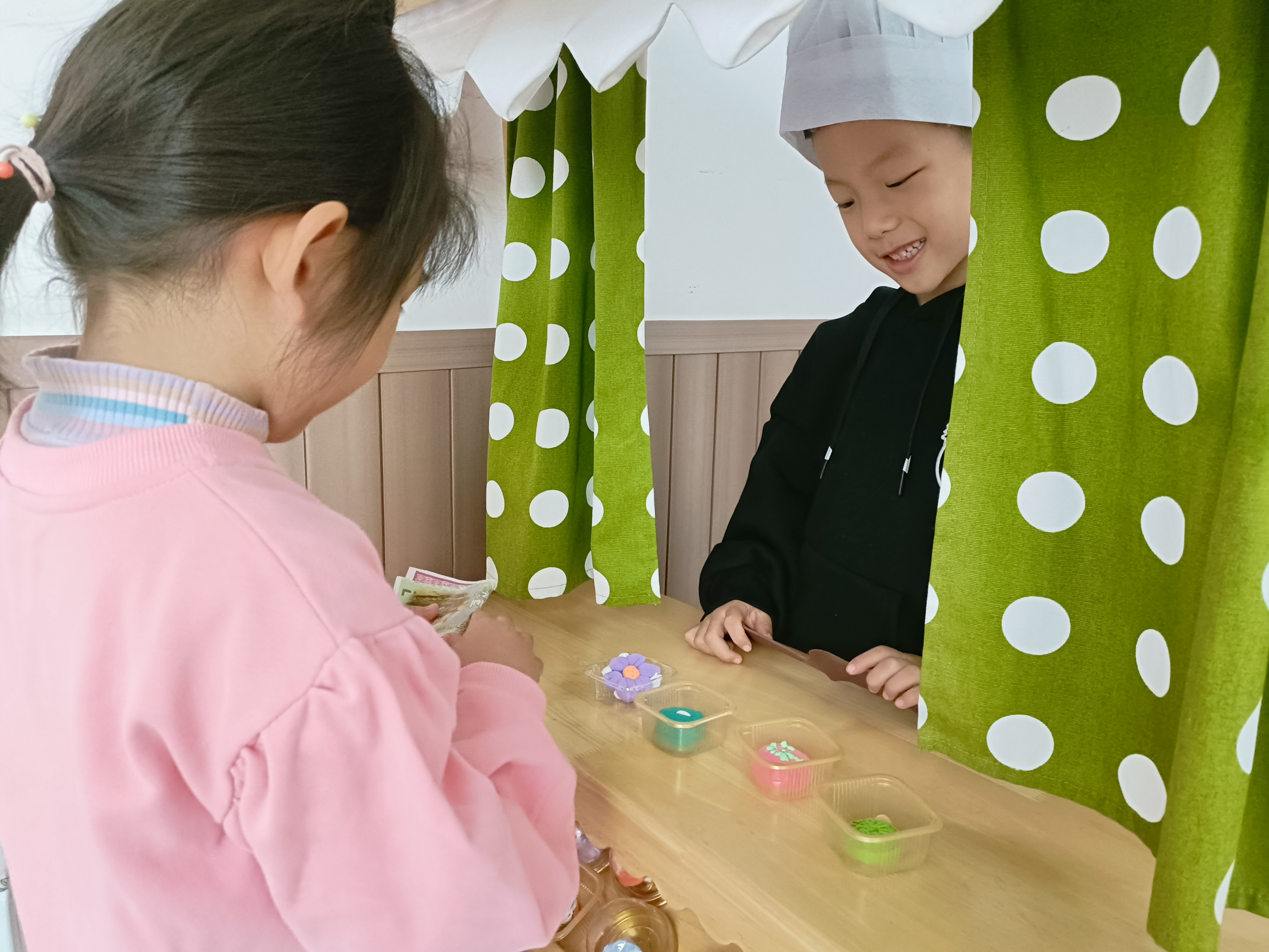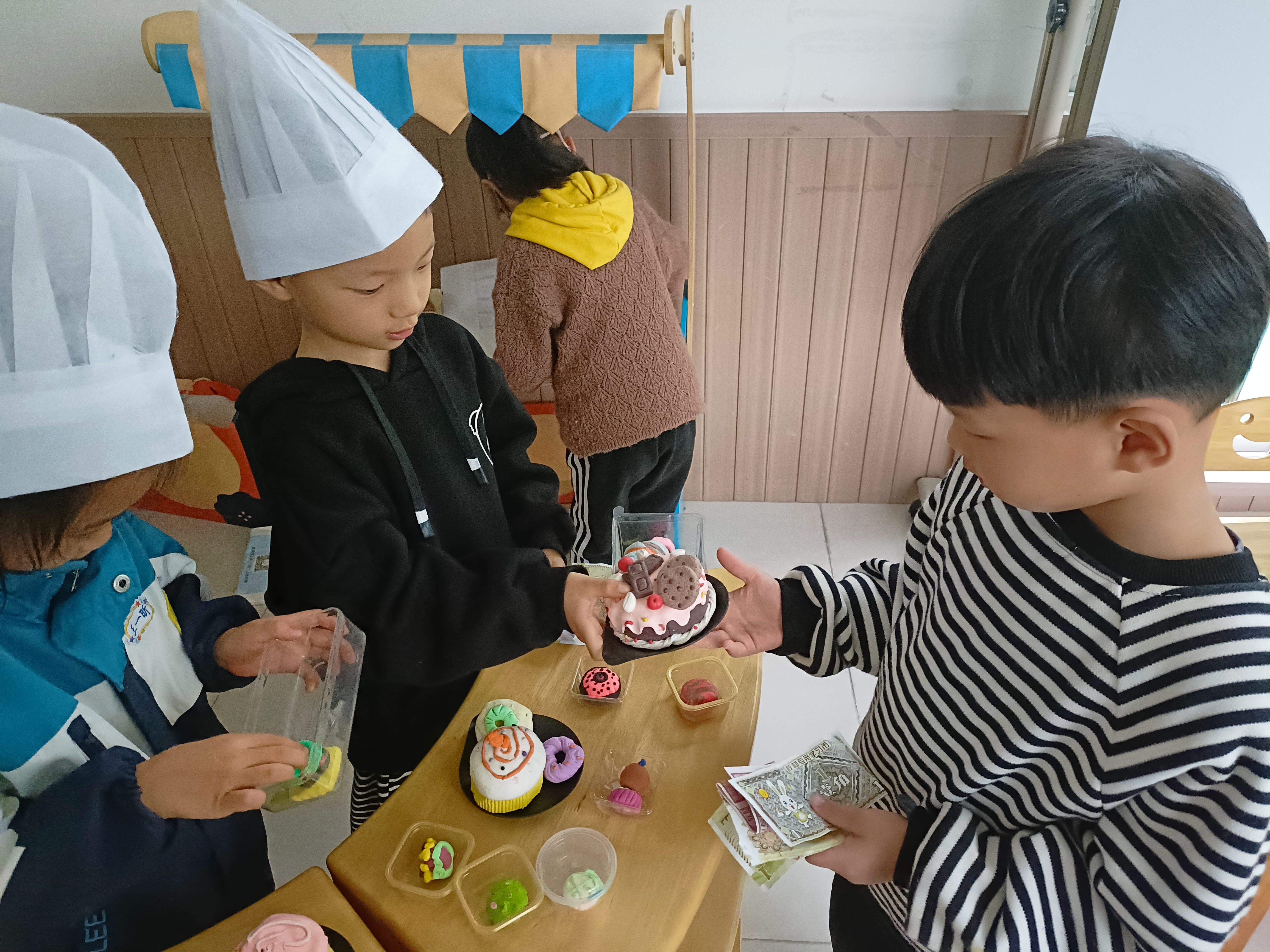角色区:烘焙坊是幼儿比较偏爱的区域,因为它与生活相贴近,处处体现亲近感,所以我们创设一个与幼儿生活相关的场景,让幼儿通过操作扮演的游戏,从侧面了解社会,增加社会生活经验。
