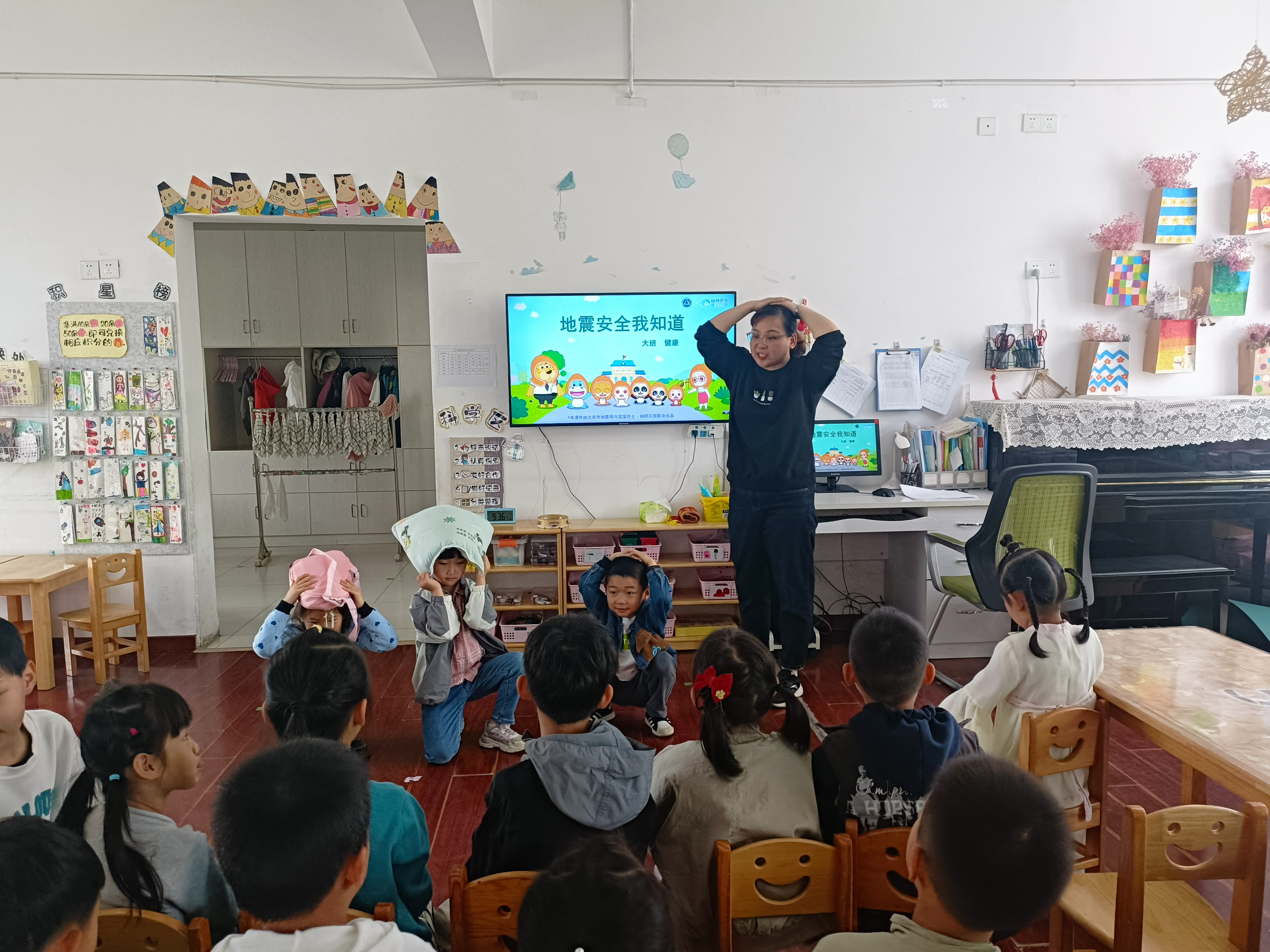 4月21日上午,班级幼儿参加全园防震应急疏散演练,当演练警报响起,幼儿在教师的有序指挥下,双手抱着枕头,沿着紧急疏散路线,有秩序地撤离到户外安全地带,老师立刻清点人数及检查幼儿身心状况,并向总指挥汇报情况。 通过防震演练,孩子们再次体验了地震现场逃生的场景,更深入的了解了逃生常识,熟悉了疏散路线,也锻炼了班级老师在面对突发意外时应有的沉着冷静的心理素质,增强了教师和幼儿的安全防范意识,提高了幼儿面对突发自然灾害的防护和自救能力。