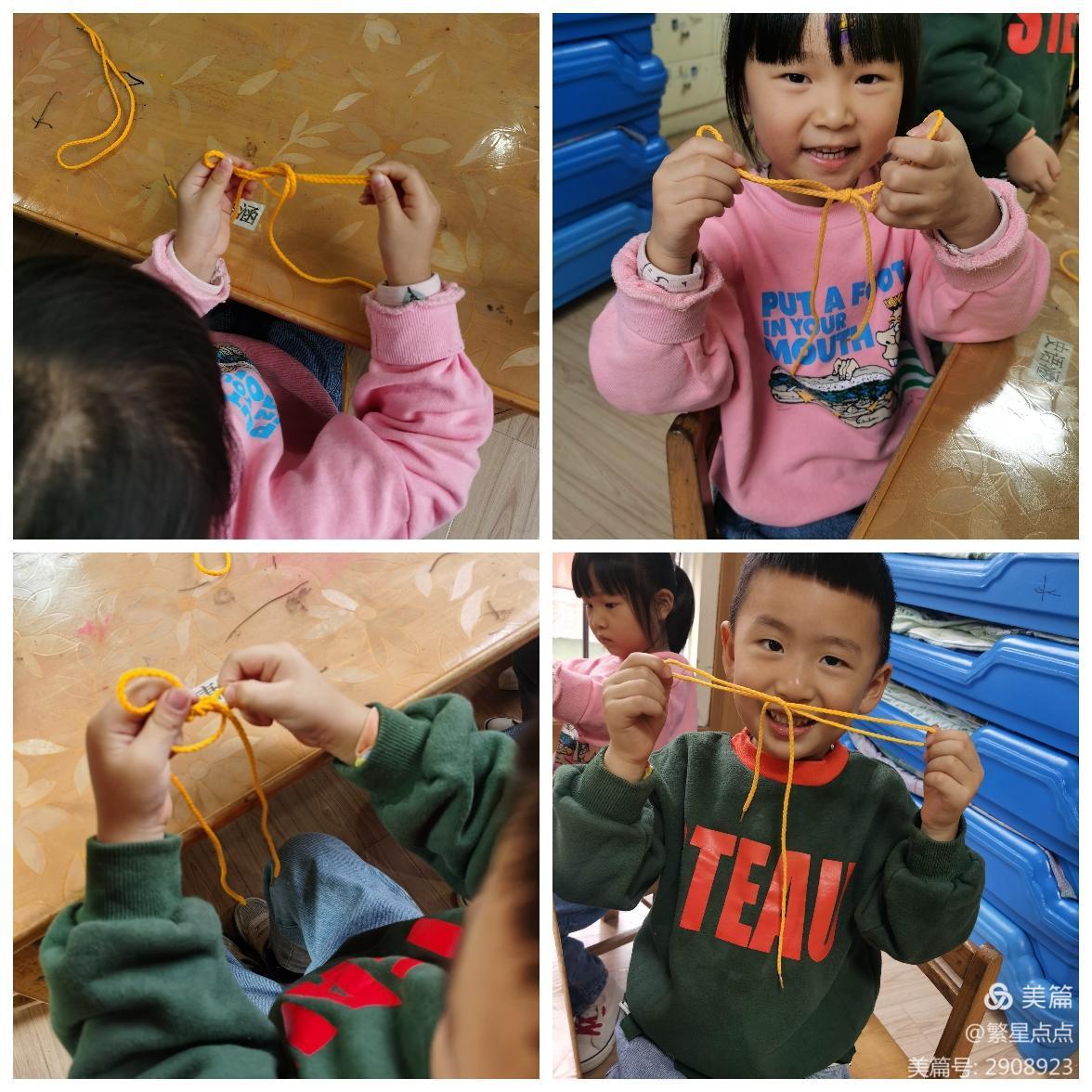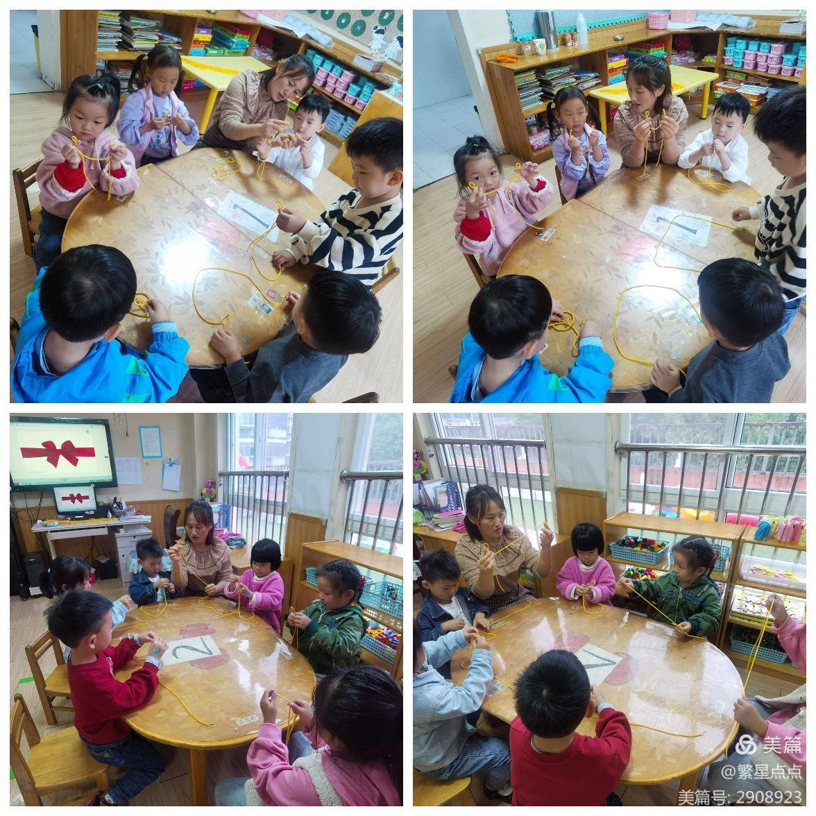 纲要中指出,幼儿园教育活动的内容应遵循“既贴近幼儿的生活来选择幼儿感兴趣的事物和问题,又有助于拓展幼儿的经验和视野。” 这就需要我们从孩子已有的生活经验出发,主动观察了解幼儿的学习兴趣和需要,从中挖掘有教育价值的能促进幼儿发展的兴趣点,并以此为依据开展相应的活动。我想蝴蝶结就是孩子们生活中常常接触到的,特别是女孩都很喜欢蝴蝶结。当我问他们在哪里见到过蝴蝶结时,孩子们争先恐后的说着“漂亮的蝴蝶结发夹”、“书包上好看的蝴蝶结装饰”、“生日蛋糕上也有漂亮的蝴蝶结”……,问孩子们想不想学扎蝴蝶结,孩子们大声的说:“想!”