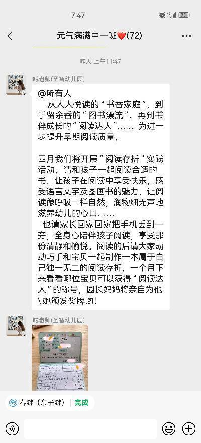 也请家长回家回家把手机丢到一旁,全身心陪伴孩子阅读,享受那份清静和愉悦。阅读的后请大家动动巧手和宝贝一起制作一本属于自己独一无二的阅读存折,一个月下来看看哪位宝贝可以获得“阅读达人”的称号,园长妈妈将亲自为他\她颁发奖牌哟!
