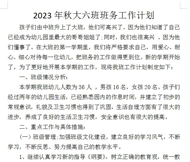 2023年秋季学期班务工作计划