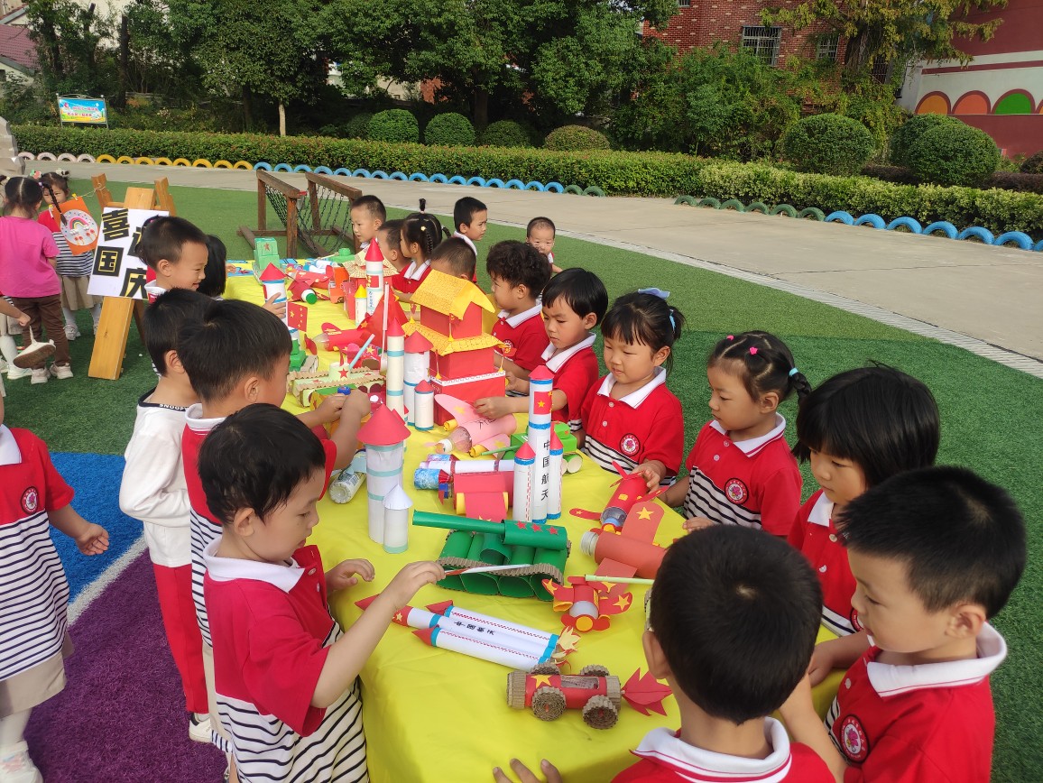 相片描述:孩子们相互欣赏自己的作品,也