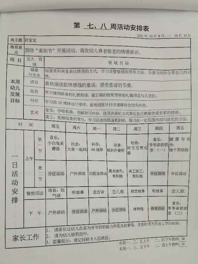 小班上学期第七、八周活动安排