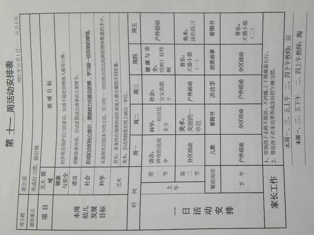 小班上学期第十一周活动安排