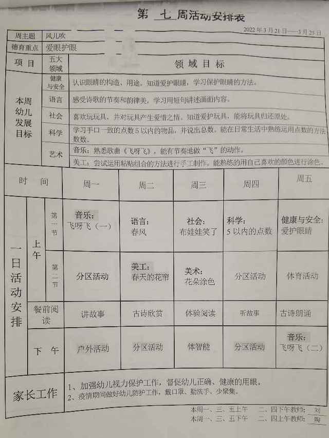 小班下学期第七周活动安排