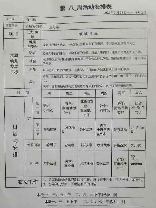 小班下学期第八周活动安排