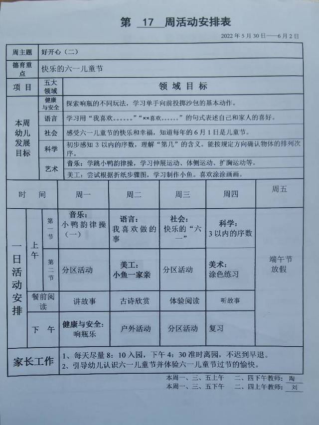 小班下学期第十七周活动安排