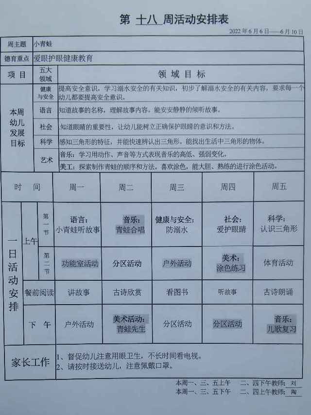 小班下学期第十八周活动安排