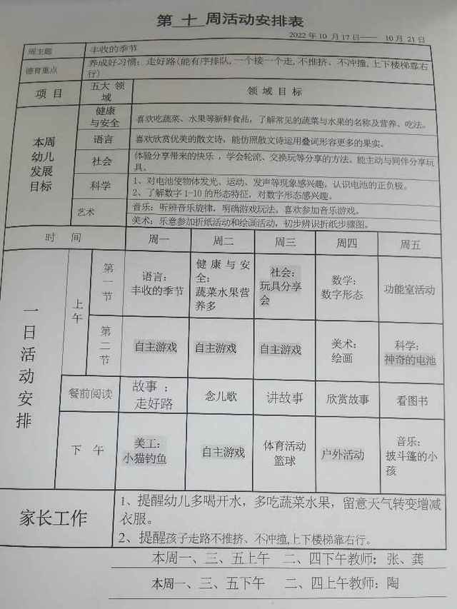 中二班上学期第10周活动安排
