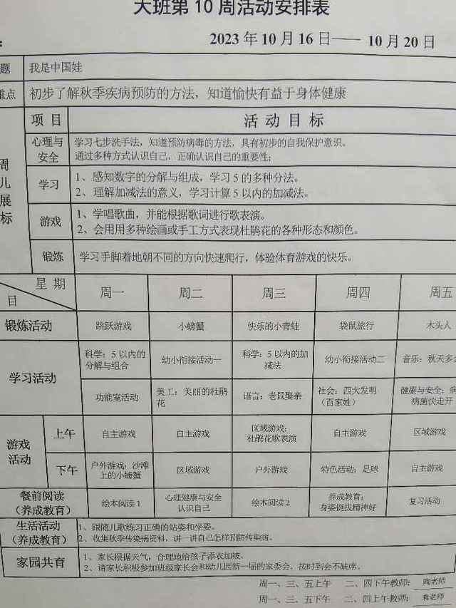 大班上学期第十周活动安排表