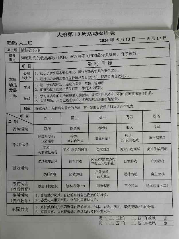 大班下学期第十三周活动安排表