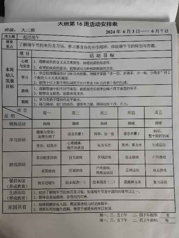 大班下学期第十六周活动安排表