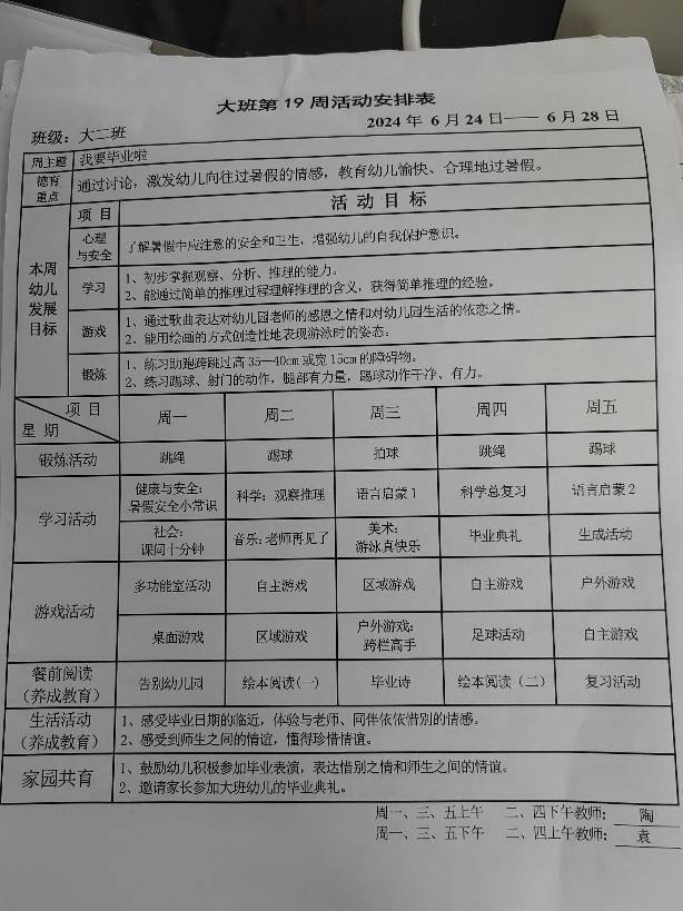 大班下学期第十九周活动安排表