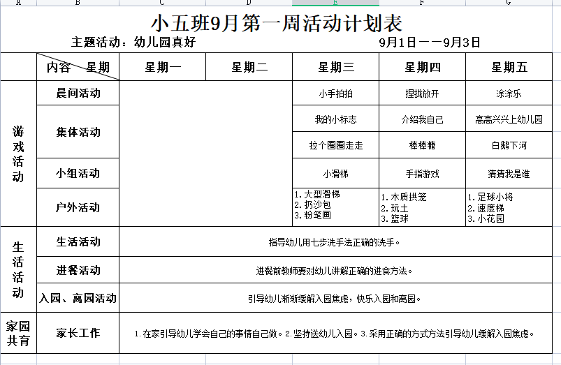 小五班9月第一周活动计划表