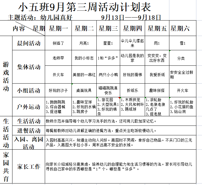 小五班9月第三周活动计划表