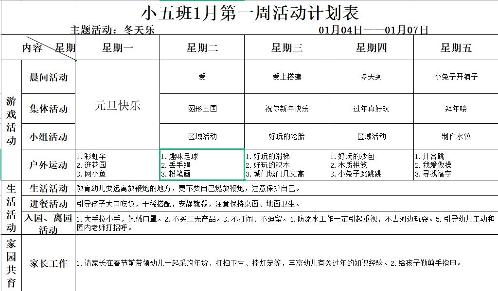 小五班01月第一周活动计划表