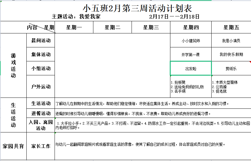 小五班2月第三周活动计划表